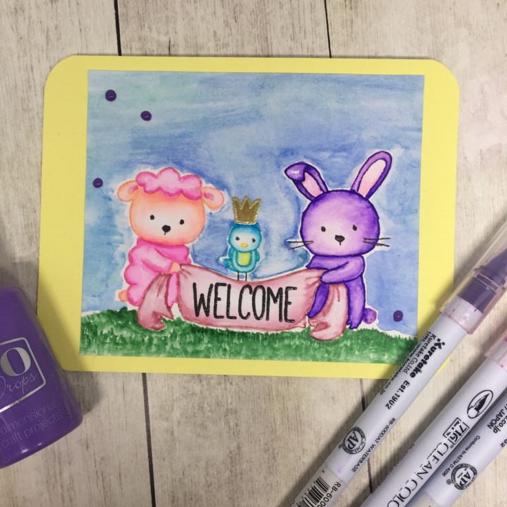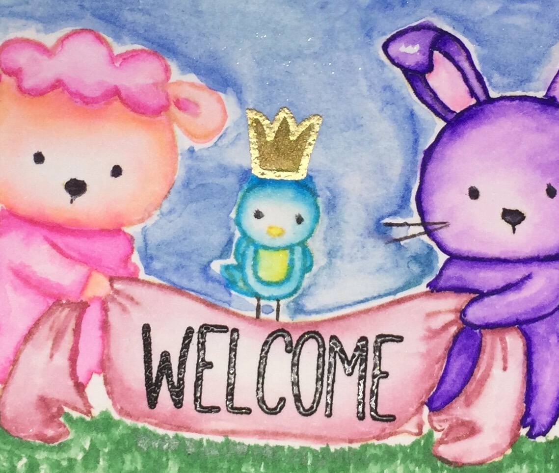 I decided to use this adorable Itty Bitty Welcoming Committee stamp. I stamped the image on some Smooth Bristol paper in Antique Linen Distress Ink so I could try to do some no-line watercoloring. I’m a bit new at this but it was fun to play with and use the Zig Clean Color Brushes.