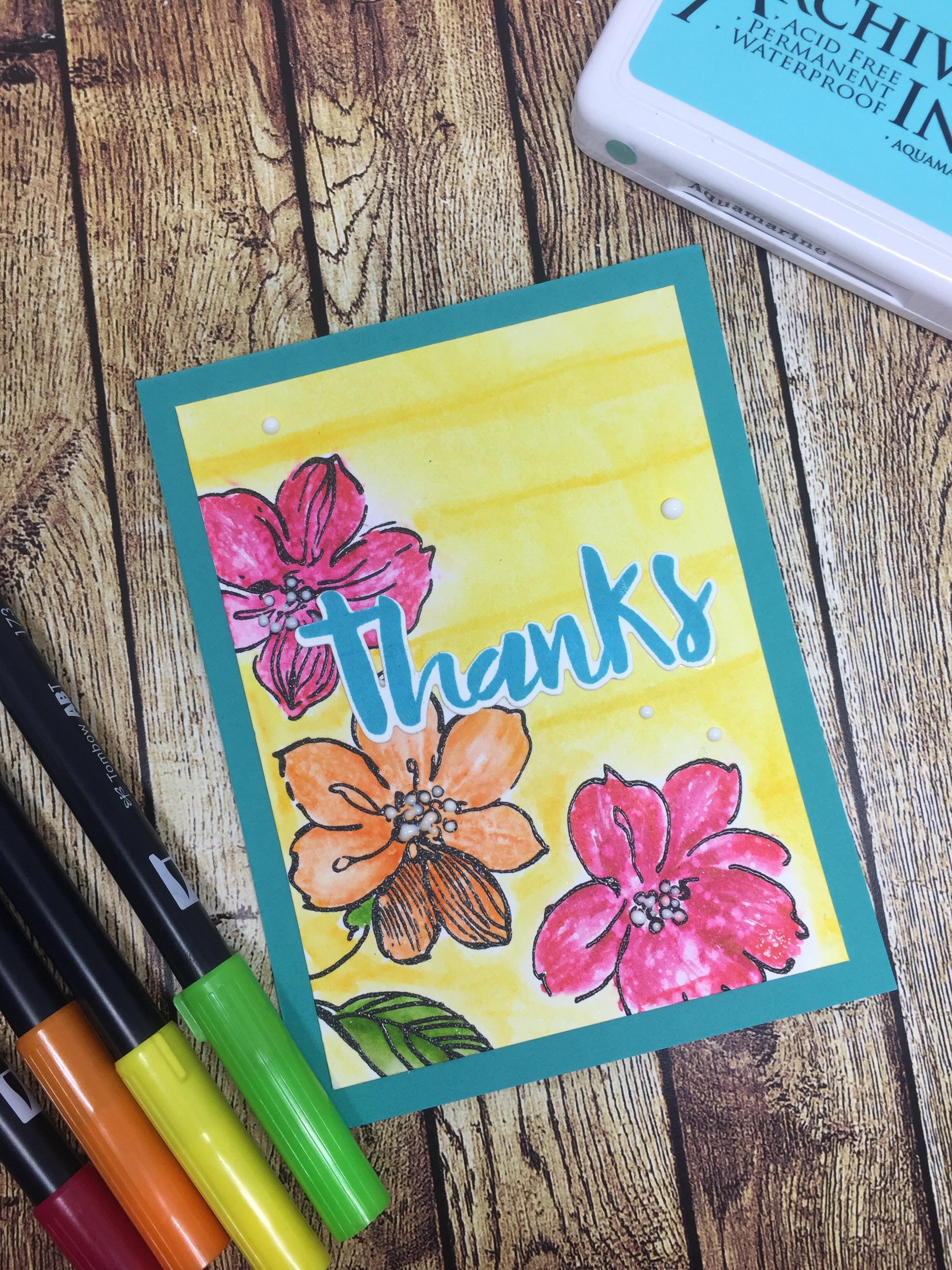 I just received this awesome Honey Bee Hello Gorgeous stamp and die. I used the die to cut out the thanks sentiment and then stamped it in Aquamarine Ranger Archival Ink. I cut down the panel and adhered it to this gorgeous Aqua cardstock from Reverse Confetti. I added some White Nuvo Crystal Drops to the flowers and card to finish it off.