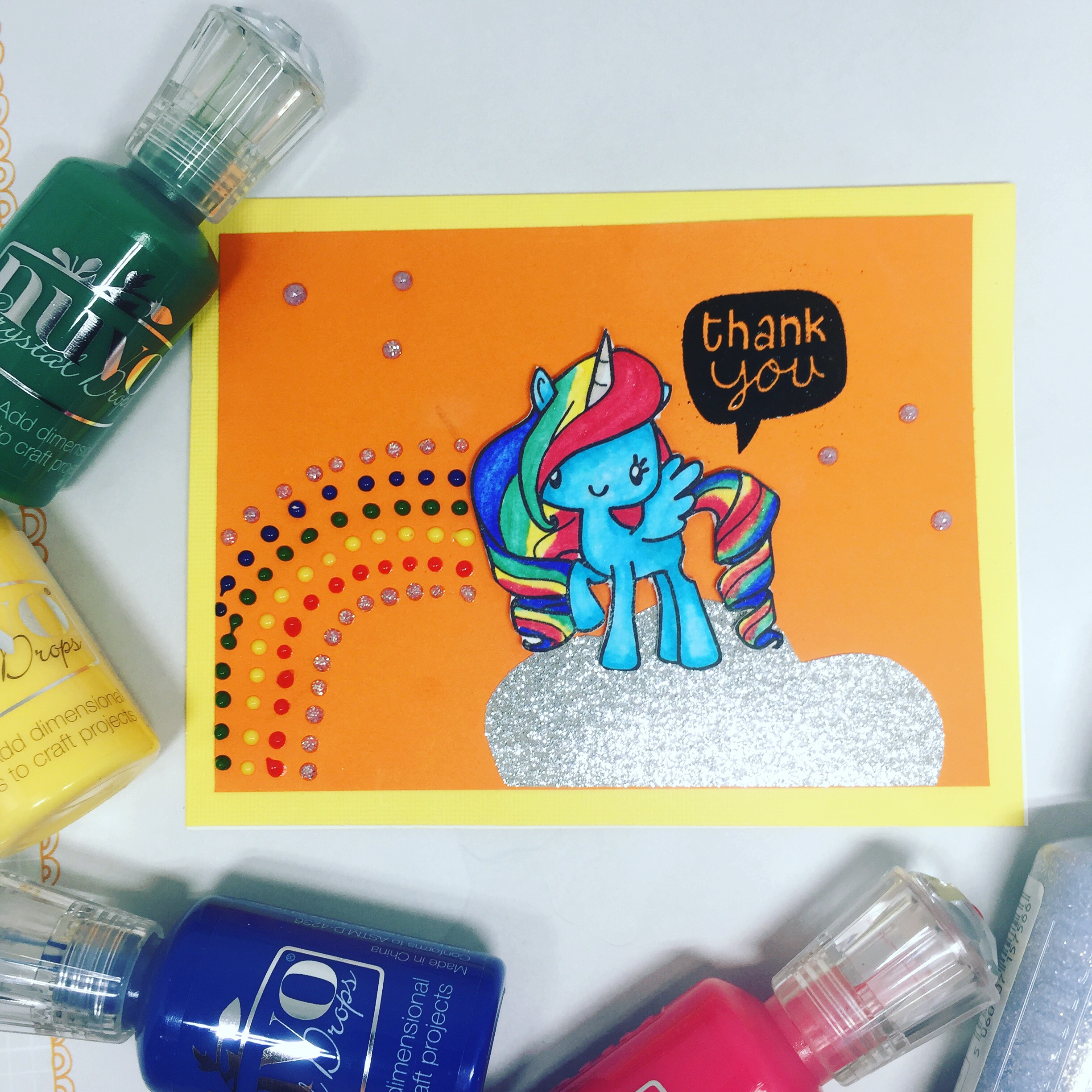 I made a little rainbow with Nuvo Crystal Drops in Glitter, Red Berry, Dandelion Yellow, woodland Green, and Midnight Blue. And every unicorn needs a sparkly cloud made out of paper.
