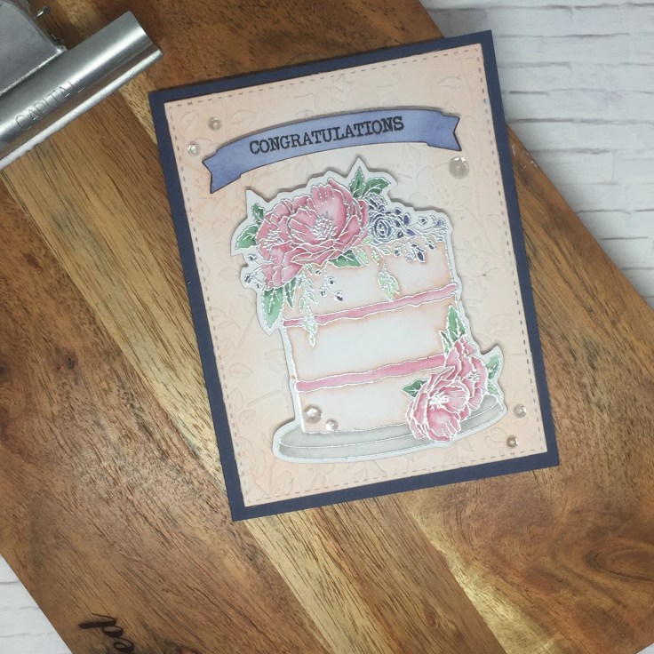 The colors for the wedding are navy and blush. I tried several cakes and decided I liked this version the best for the card. The banner and sentiment is also from the same stamp set and I used Chipped Sapphire Distress. I adhered both with foam tape to the background and added some clear sequins.