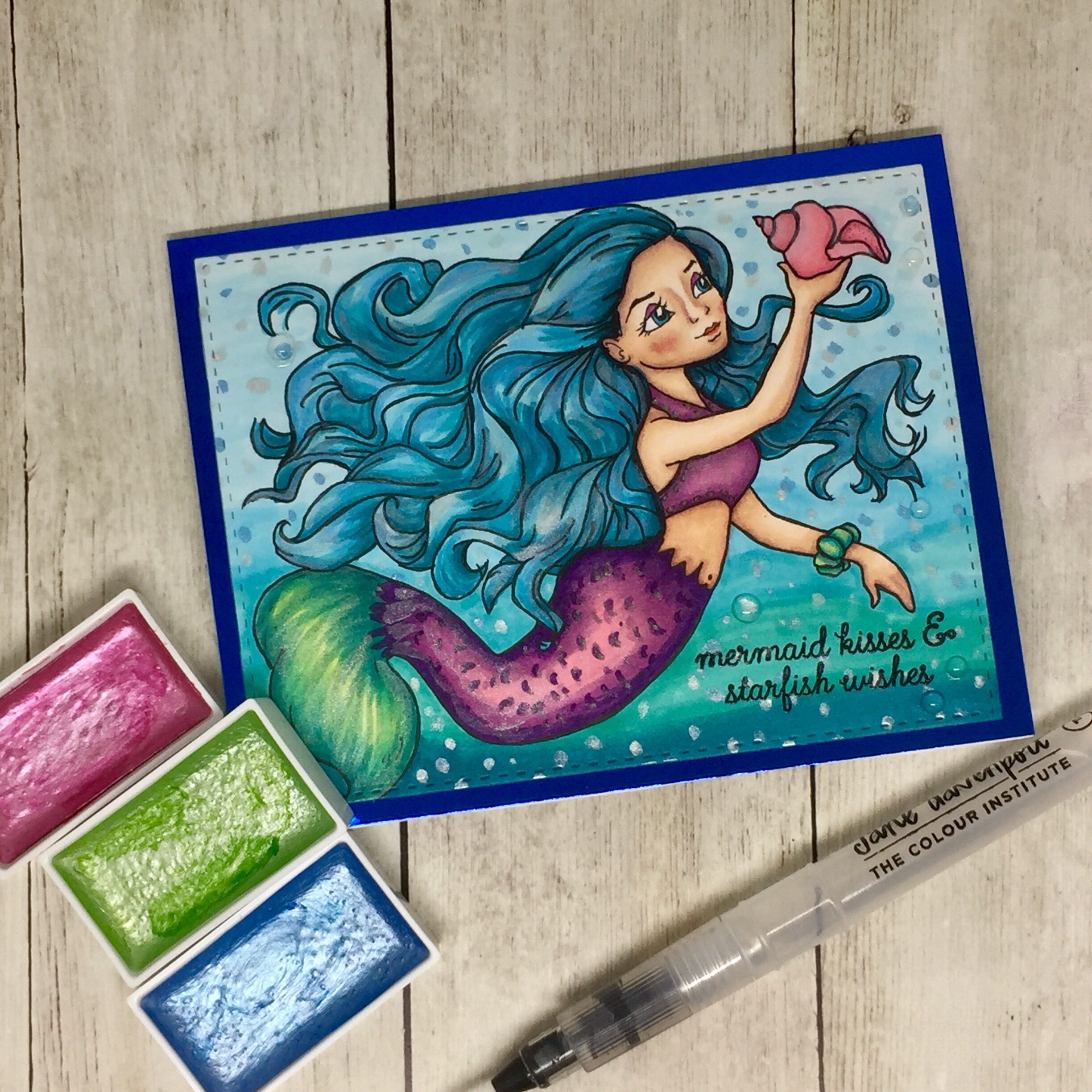 I started coloring the mermaid with my Copics using the techniques I learned from the monthly class. I love these color combos that Alyce has come up with. Once I was finished, I wanted to add some sparkle to her so I pulled out my Kuretake Gansai Tambi Pearl Colors to add a little shine. It’s a little hard to get a good photo of the sparkle. I added the sentiment from Reverse Confetti’s Mermaid Kisses. To finish the card, I adhered it to some shiny blue card stock I had in my stash.