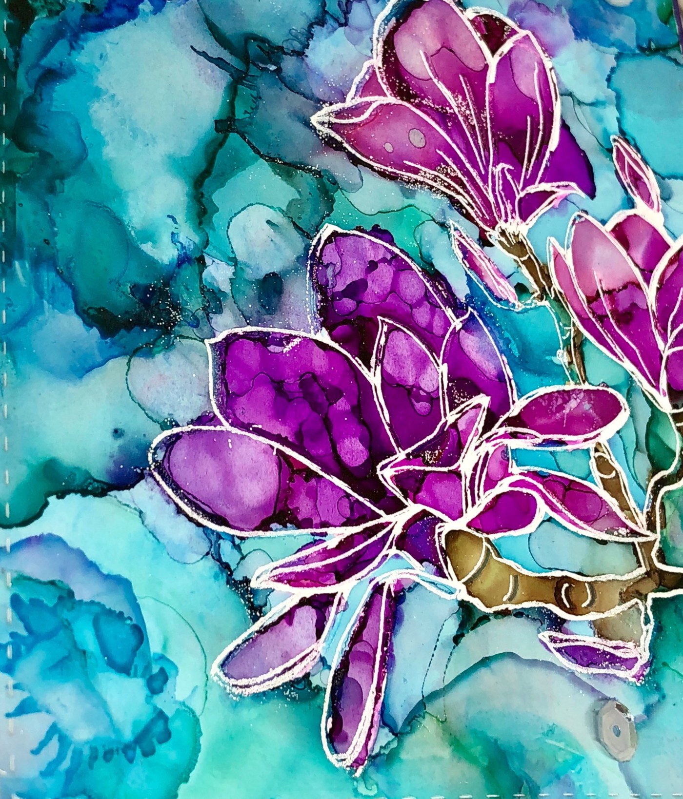 For my second card I used similar colors but this time in Alcohol Inks. I stamped the magnolias in my MISTI on Yupo paper in Versamark ink and white heat embossed it.  Make sure to let the heat tool get really hot in order to limit warping. I also taped the image to a clipboard to limit any warping. I used pink sherbet, raspberry, wild plum, and a little purple twilight for the magnolias. I dropped in color on some petals and also took a small paint brush and dabbed it in spaces. For the branches, I used espresso and thinned out the color with some blending solution. The background was made with various blues: patina, pool, turquoise, and cloudy blue.