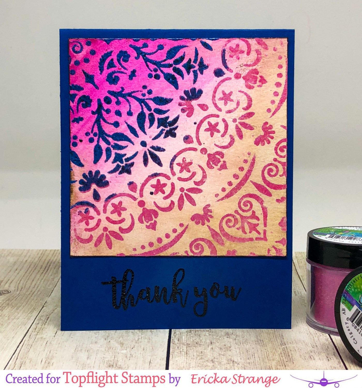 I’m over at the Topflight blog and I hope your Friday is going well. I’ve been experimenting with some Emerald Creek Rita Barakat Magical Mysteries Embossing Powders. These have been so fun to play with and I love the colors I have and might have to get the full set soon! When these powders melt they are shiny and gorgeous. Here are a couple of cards I made with these beautiful powders.