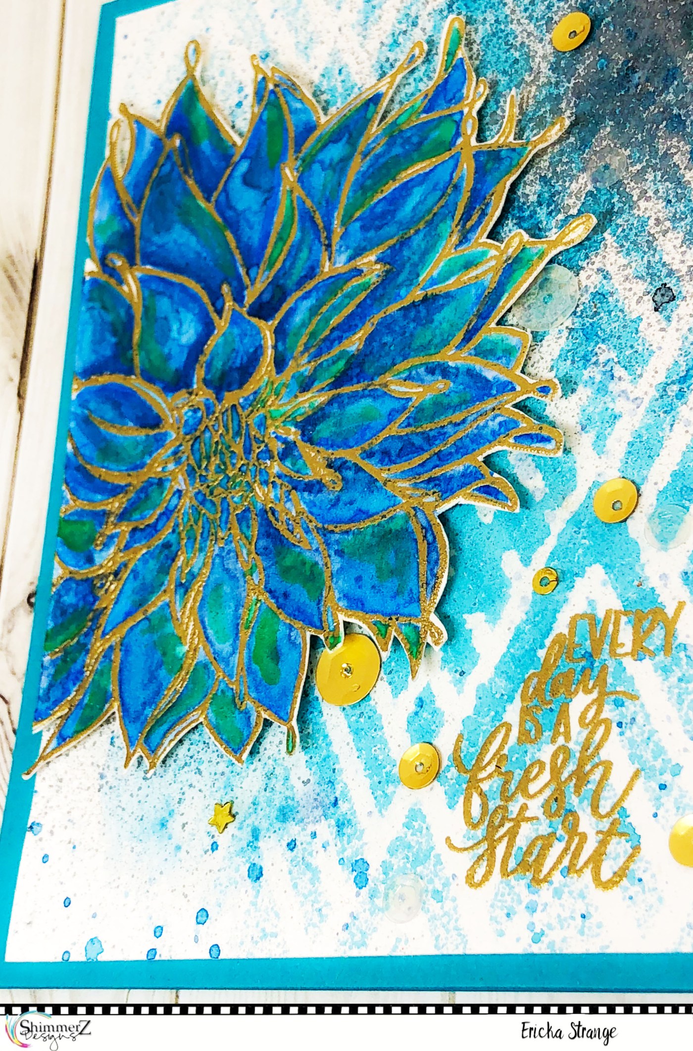 Once I was done with the flowers, I started on the background using watercolor paper. I took an Altenew stencil and used the Vibez spray in Jeni B Bleu to mist a light pattern. I also added a little Vibez spray Before Dawn and splatters from the Shimmerz I had used for the flower.
