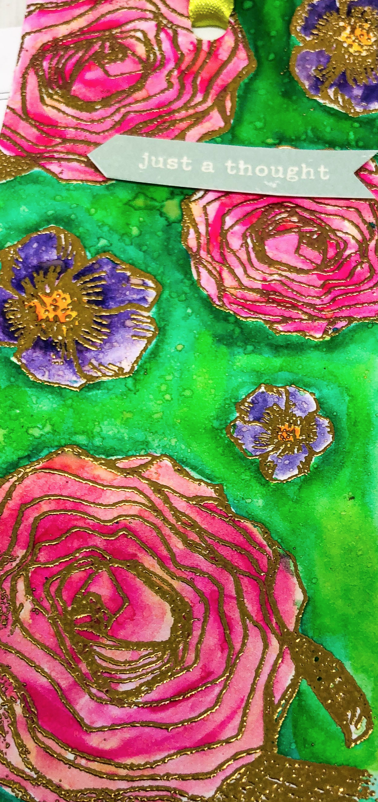 I started by stamping the flowers on some Bristol Smooth paper in Versamark ink and gold heat embossing them. Then, I used the Jane Davenport Mermaid markers to color my flowers using similar colors to loosely blend them with a waterbrush.
