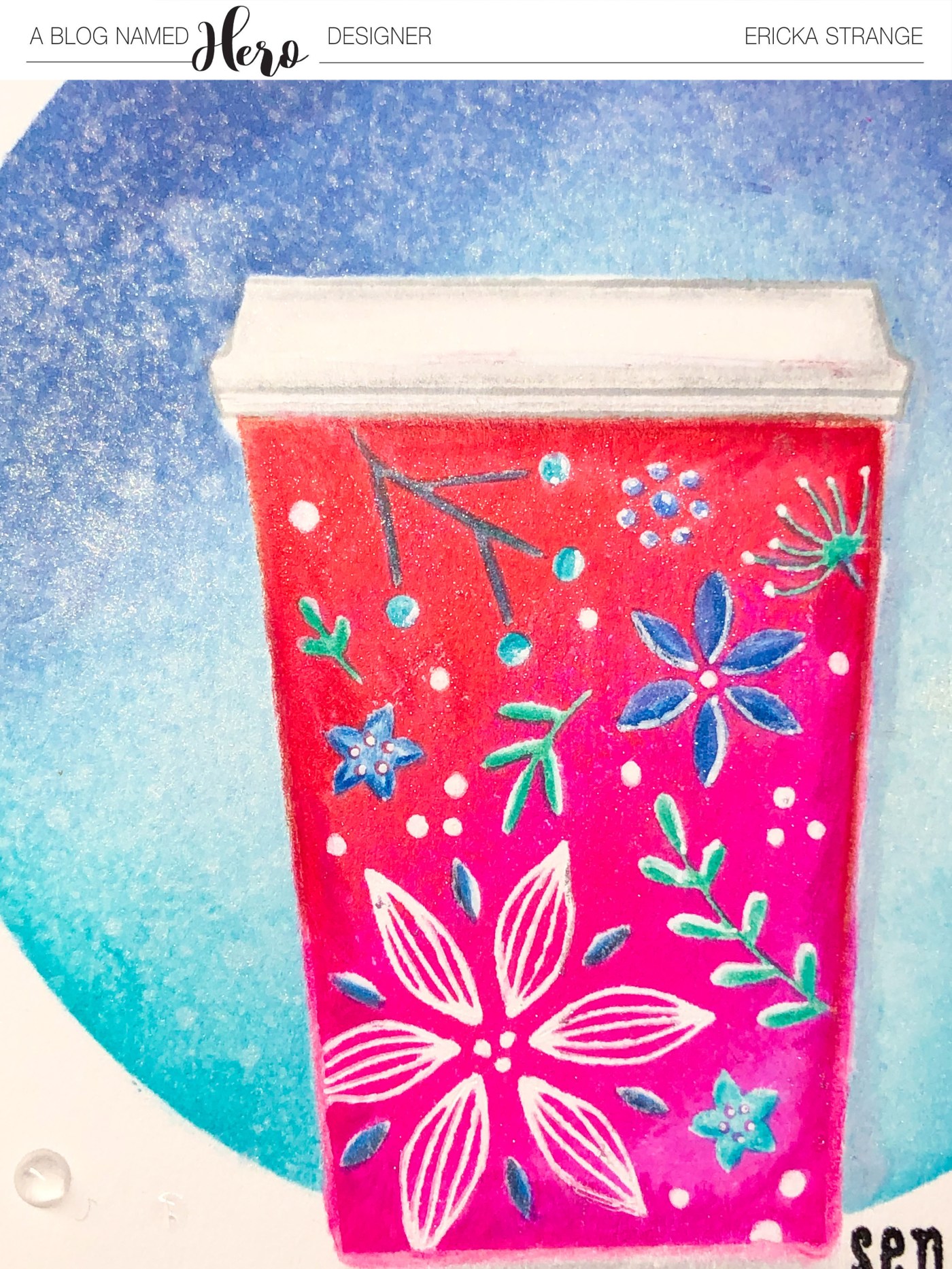 I started by stamping the coffee cup in Neon Ombre ink on Neenah Solar paper. Then I used my color pencils and gel pen to color in the flower decorations on the cup.