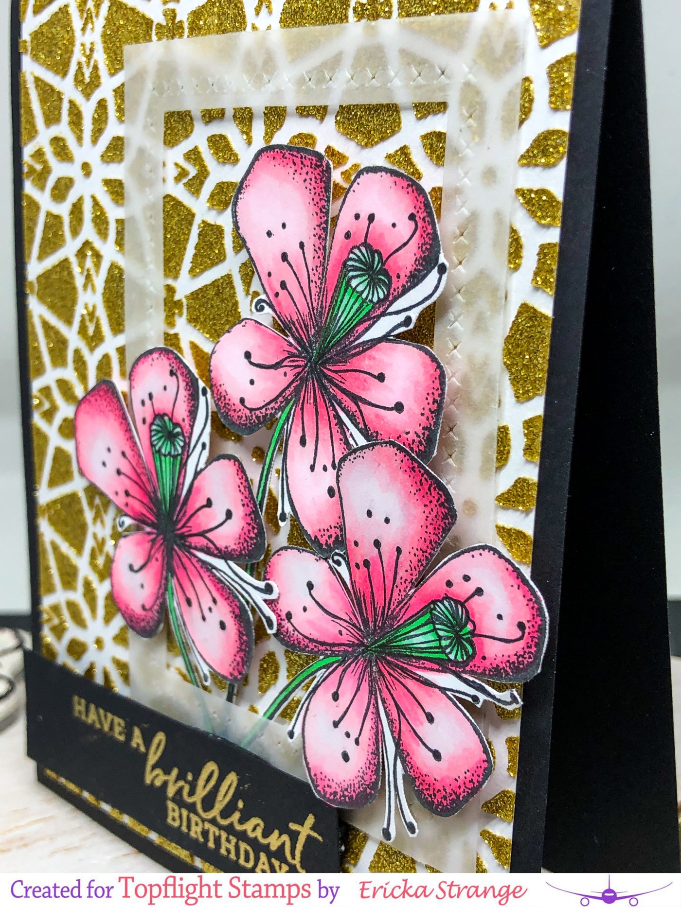 While my background was drying, I stamped the flowers on Copic friendly paper and started coloring them. I for the petals I used, RV19, RV21, RV23, and RV25. The green was a combo of G00, G03, and G05. After I finished coloring, I retraced the images in black pen.