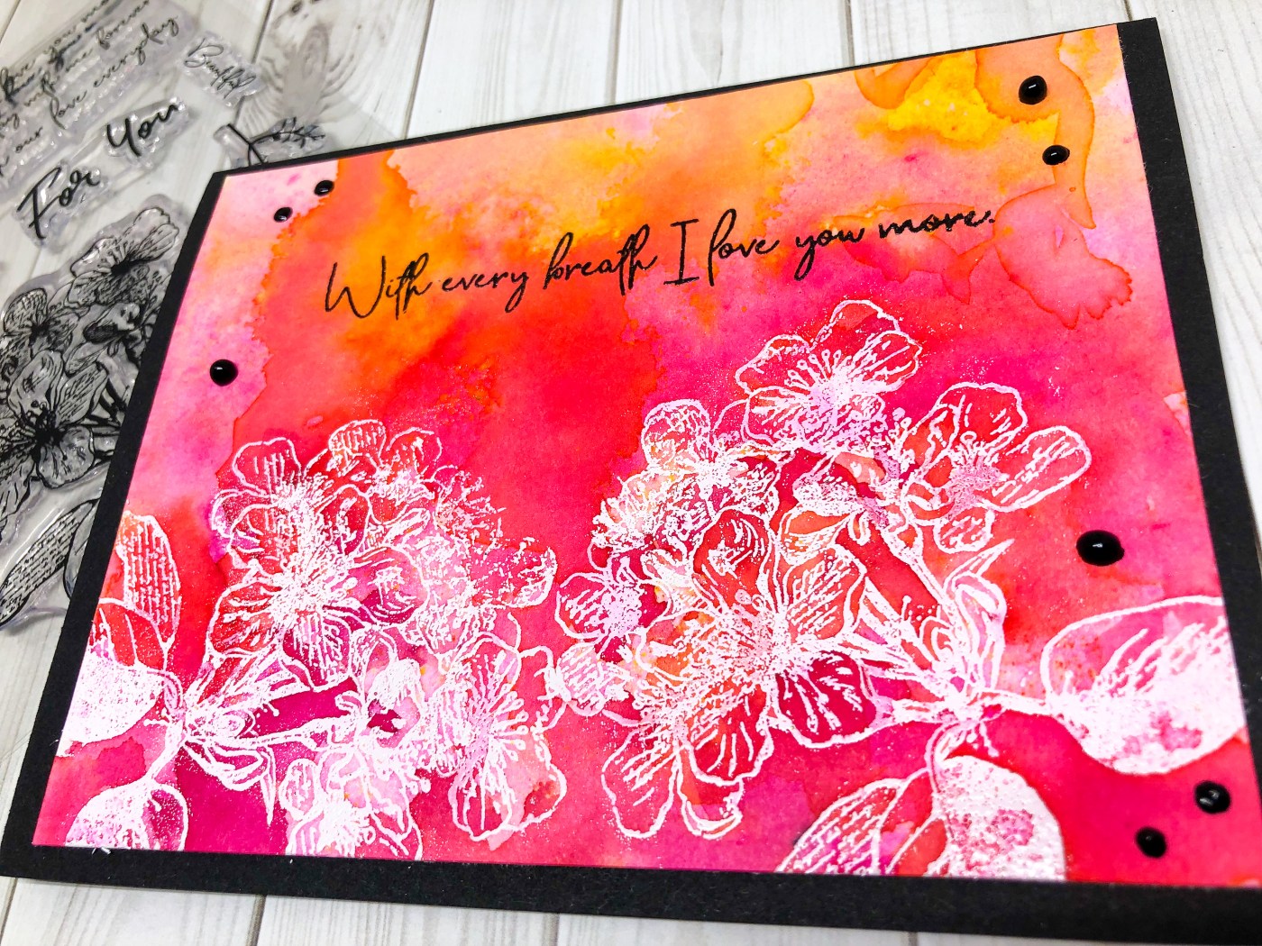 I started by stamping the floral image on watercolor paper and white heat embossing it. Then I started playing with three colors of Color Bursts – Peony, Cadmium Scarlet, and Lemon Yellow.