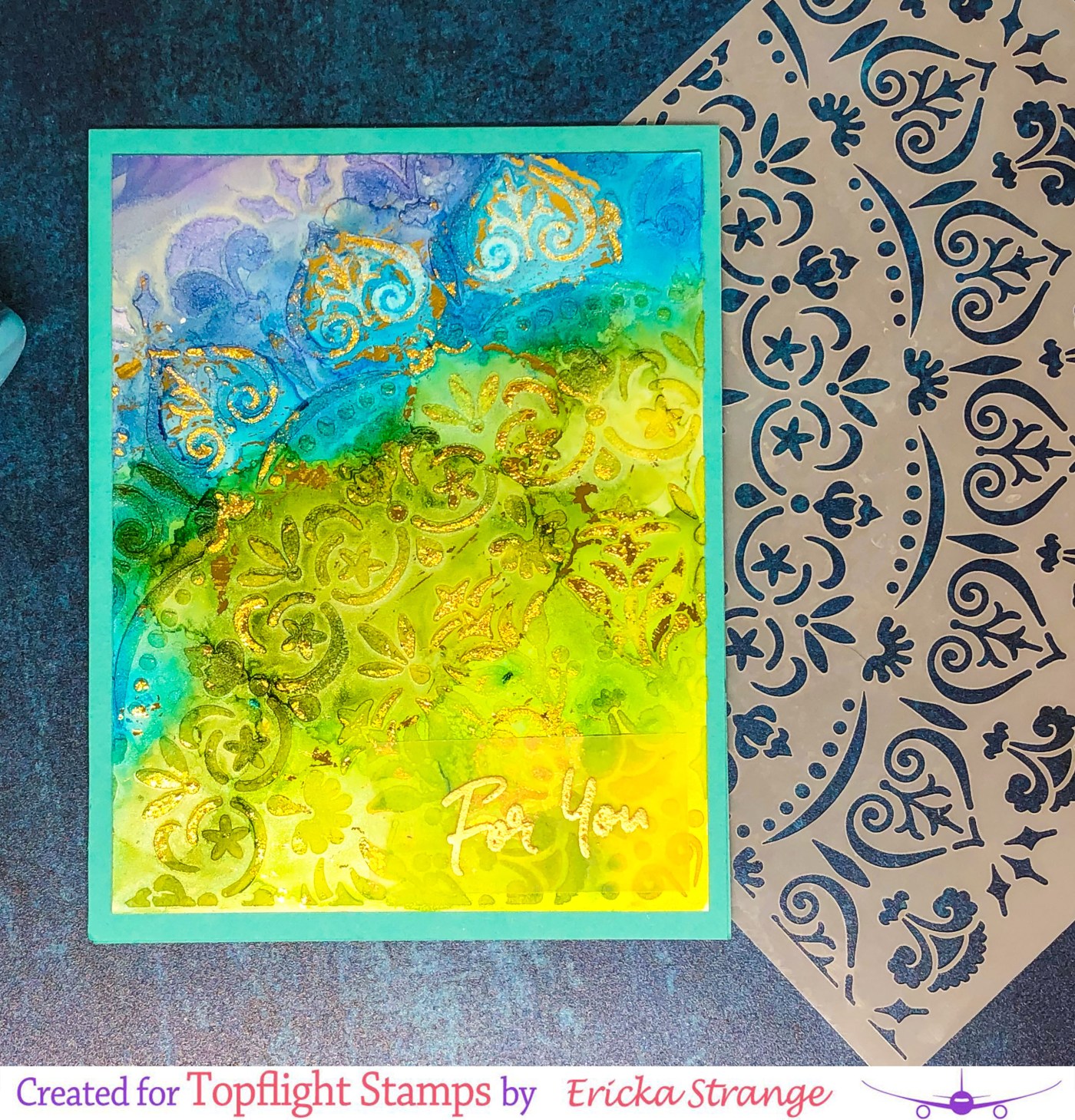 I hope you are having a beautiful spring day. I’m over at Topflight Stamps playing with a technique I saw watching Jennifer McGuire use here. I was so inspired I had to get out my alcohol pearl inks and my favorite Alexandra Renke stencil and play. Here is one of the cards I made.