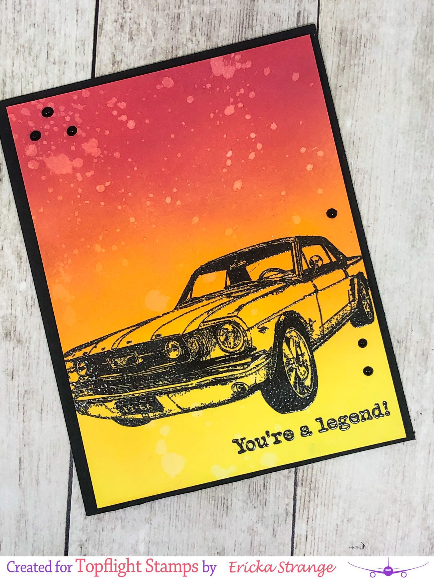 For this card, I simply blended some Distress Oxide inks in Barn Door, Carved Pumpkin, and Squeezed Lemonade on Bristol Smooth paper. I stamped the car and sentiment in Versafine ink and clear heat embossed it. A couple flicks of water and some black Nuvo drops, my Father’s Day card is complete.