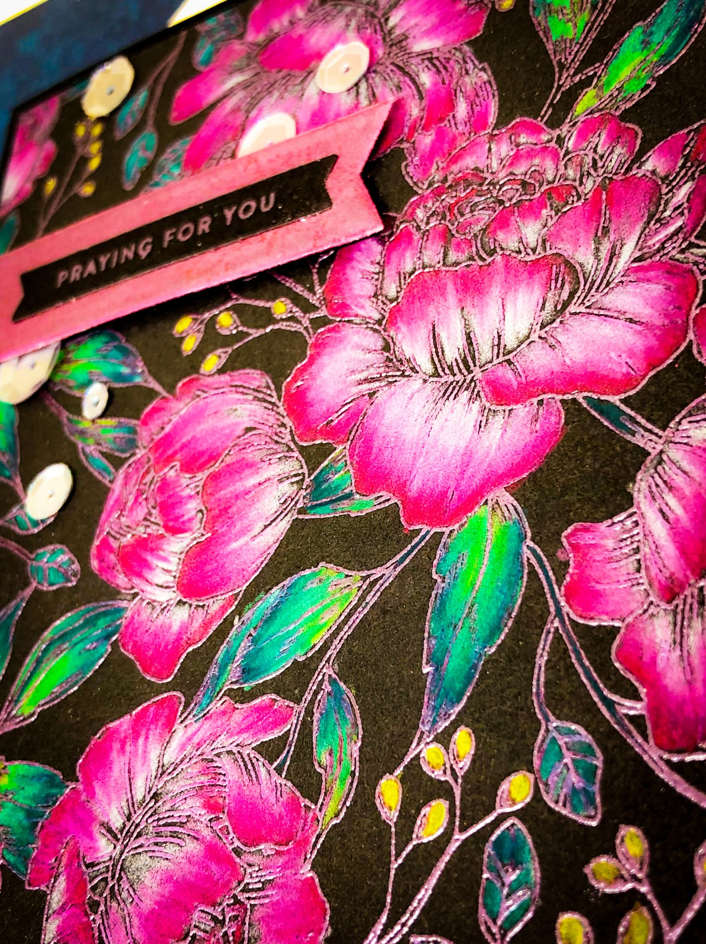 That’s not an embossing color I’ve seen before but I love the way it accents the flowers and makes the leaves glow. You’ve colored the image beautifully, Ericka.