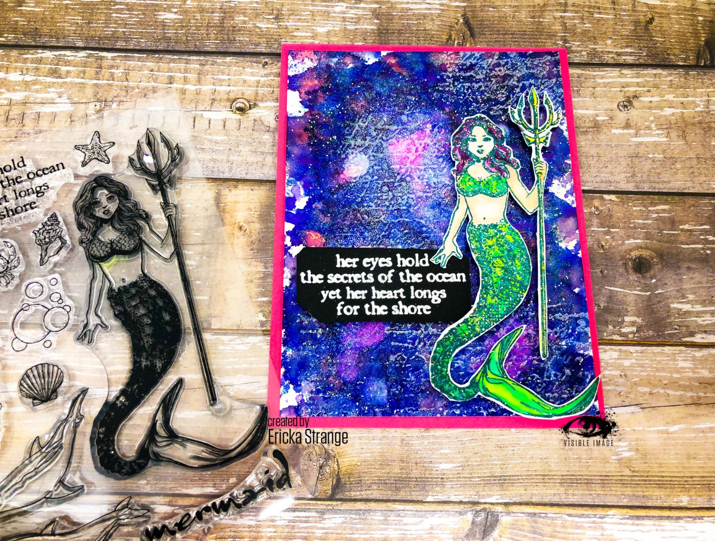 I hope that your week has been going well. I’m not sure if you’ve heard but it is officially fall here in the United States which means Pumpkin Spice everything. However, Houston TX where I live did not get the message as it is still 101° F which does not feel like fall. In fact if we had a pool I would probably be in it all day long trying to escape the heat. A mermaid might be my spirit animal lol. So, it’s no wonder I can’t stop making mermaid cards with this Visible Image Mythical Mermaid.