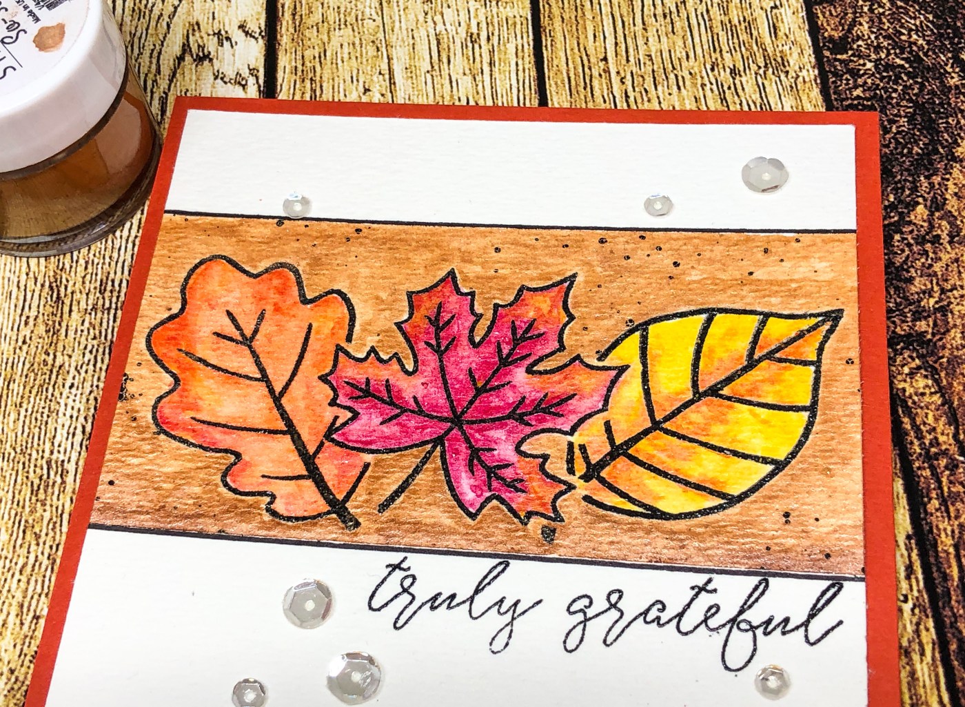 I stamped my leaves on watercolor paper and masked off the top and bottom sections to get a clean line. I used clear embossing powder over the Versfine ink so that my lines on my leaves would remain crisp.