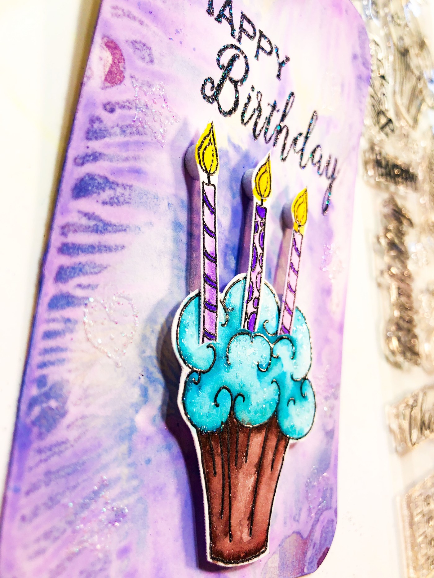 I fussy cut out the images and then used a craft knife to cut three tiny slits in the cupcake to stick my candles through. I attached them with some foam tape and then decided to add a little more sparkle to the tag with some clear sparkle embossing of some sprinkles on the cupcake, hearts and stars around the tag.