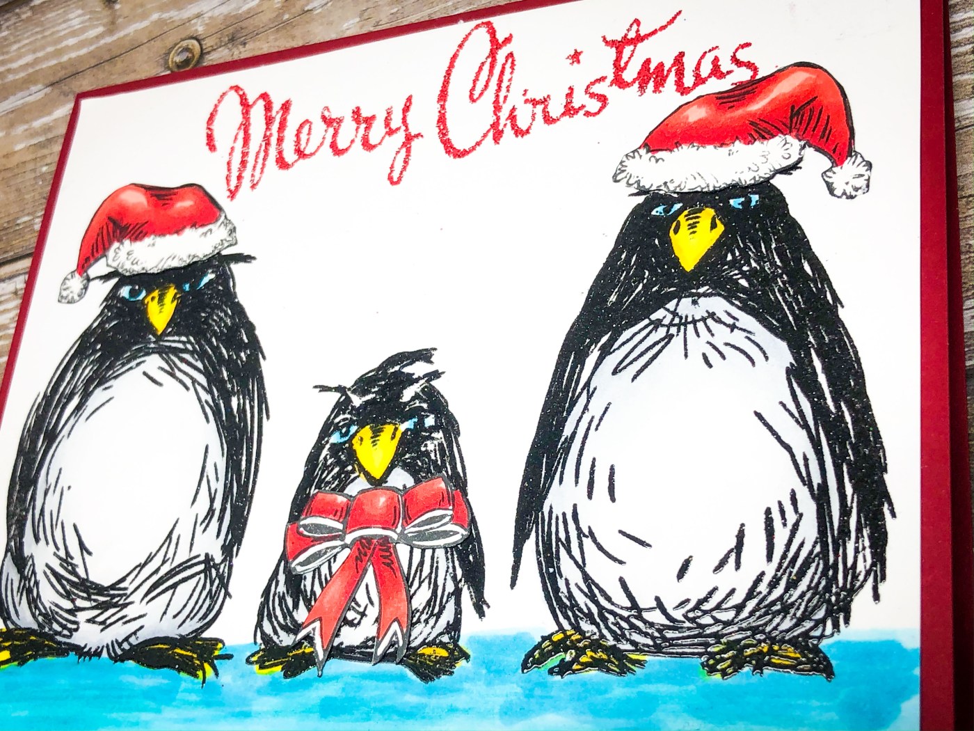 I cut the hats and bow and used glued them to the penguins. I finished with Red Tinsel Embossing Powder for the sentiment.