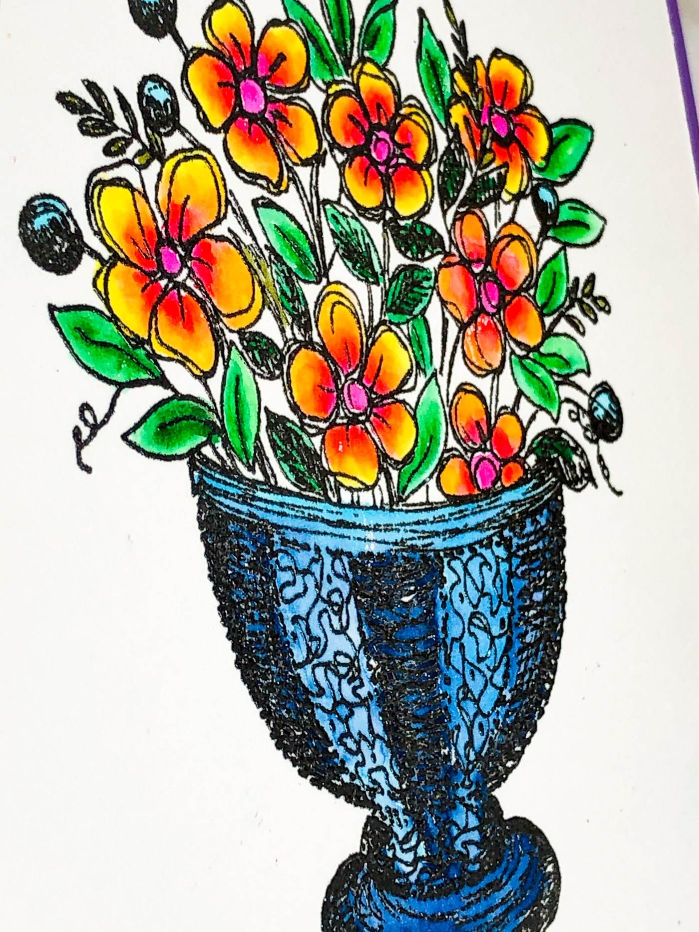I started by stamping my image on Bristol Smooth paper with Versfine ink and clear heat embossing it. I love these whimsical flowers and used my Zig markers to color them up.
