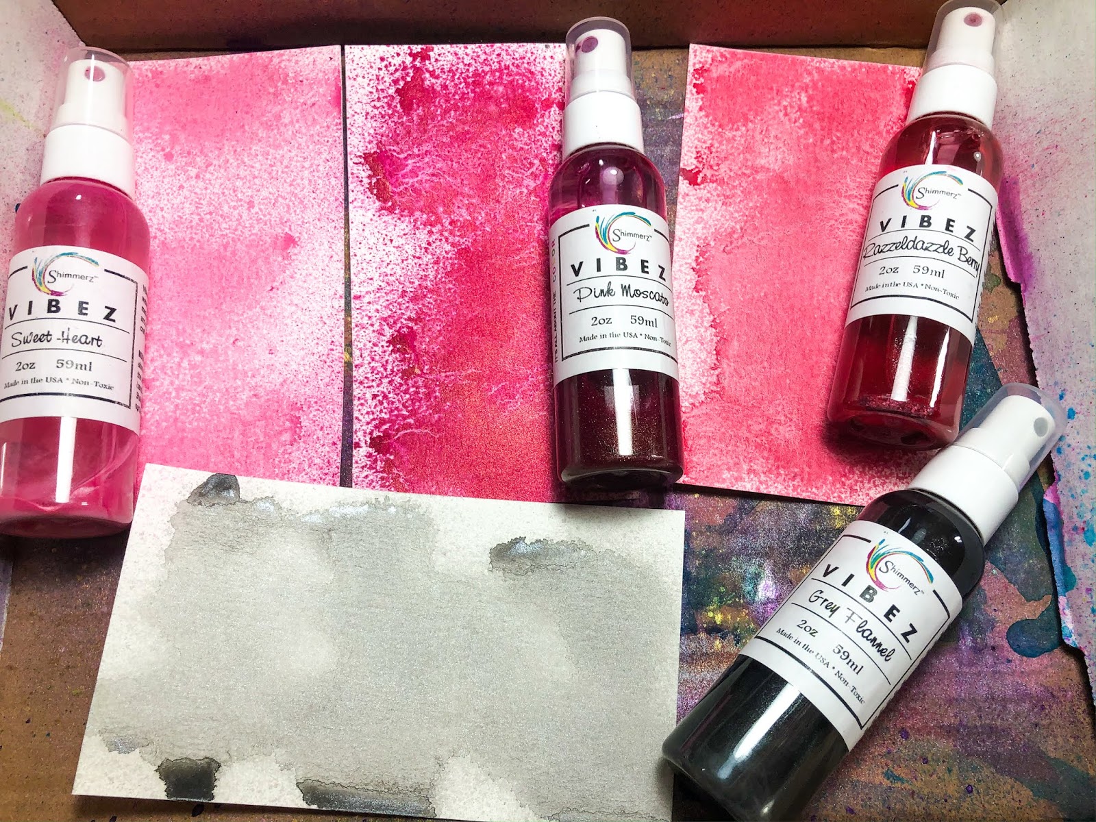 I started by spraying Vibez in a variety of pinks using Sweet Heart, Pink Moscato, and RazzleDazzle Berry on watercolor paper. (I’ll use the Gray Flannel on another project.)