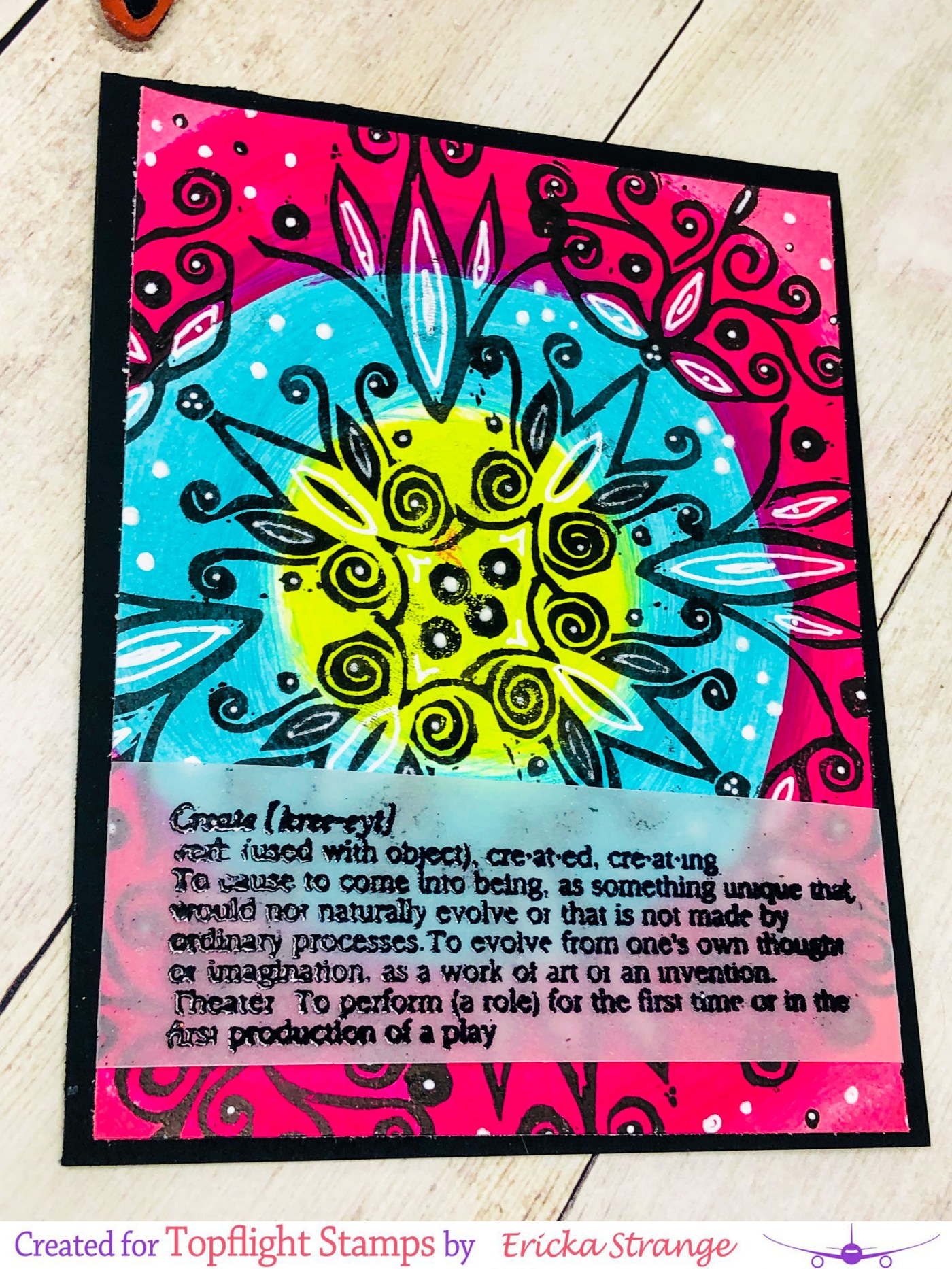 Once I was done stamping, I added a details with a white gel pen. I stamped the Create sentiment stamp from Creative Expressions on vellum with Versamark ink and black heat embossed it.