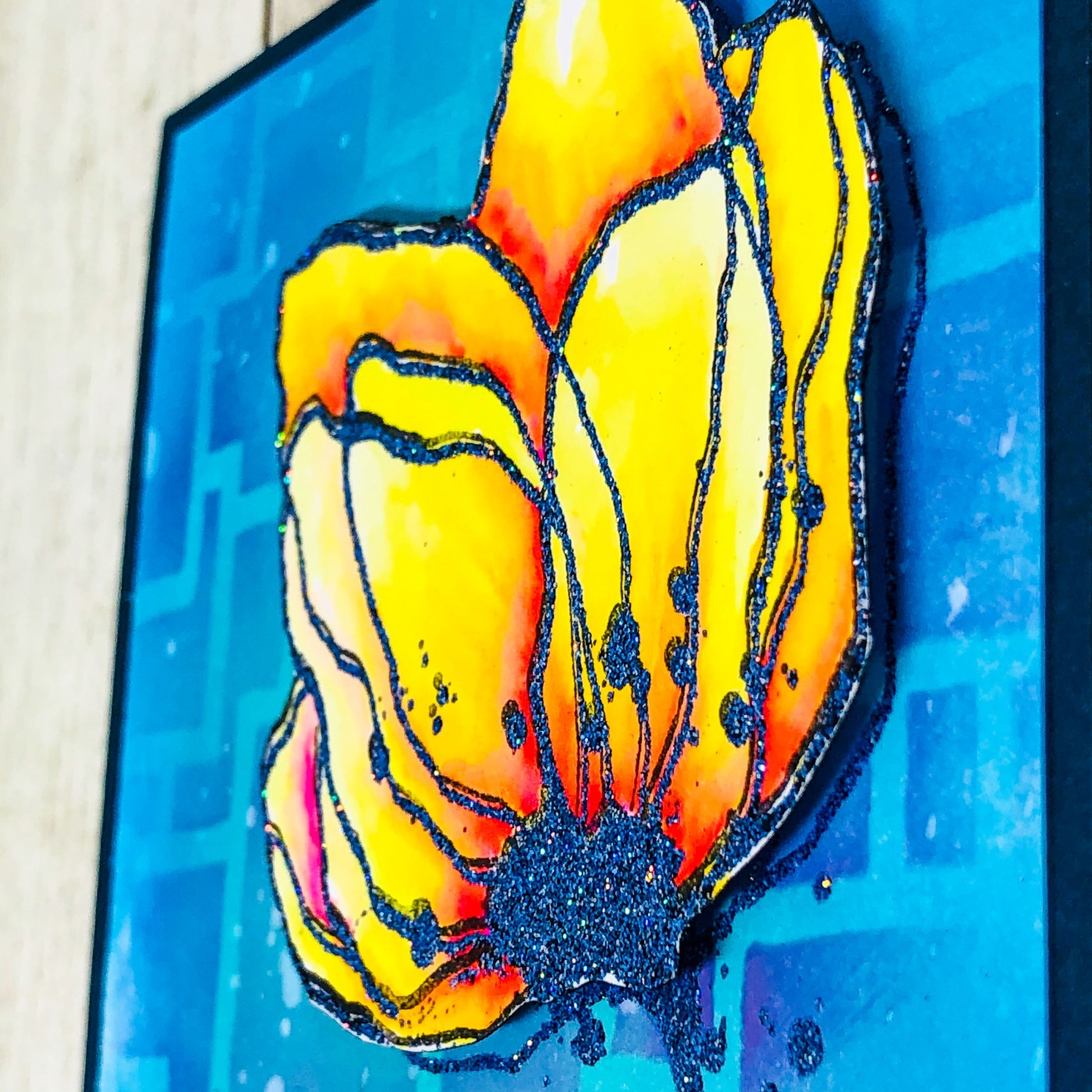 While my panel was drying, I stamped the flower on another piece of Bristol Smooth paper and heat embossed it with WOW Midnight Dream Embossing Powder. I love the sparkle and shine it give any image. I colored up my flower with Zig Real Color Brush pens and then fussy cut out the image. I stamped and embossed the same image on the panel and then attached my flower with some foam tape.