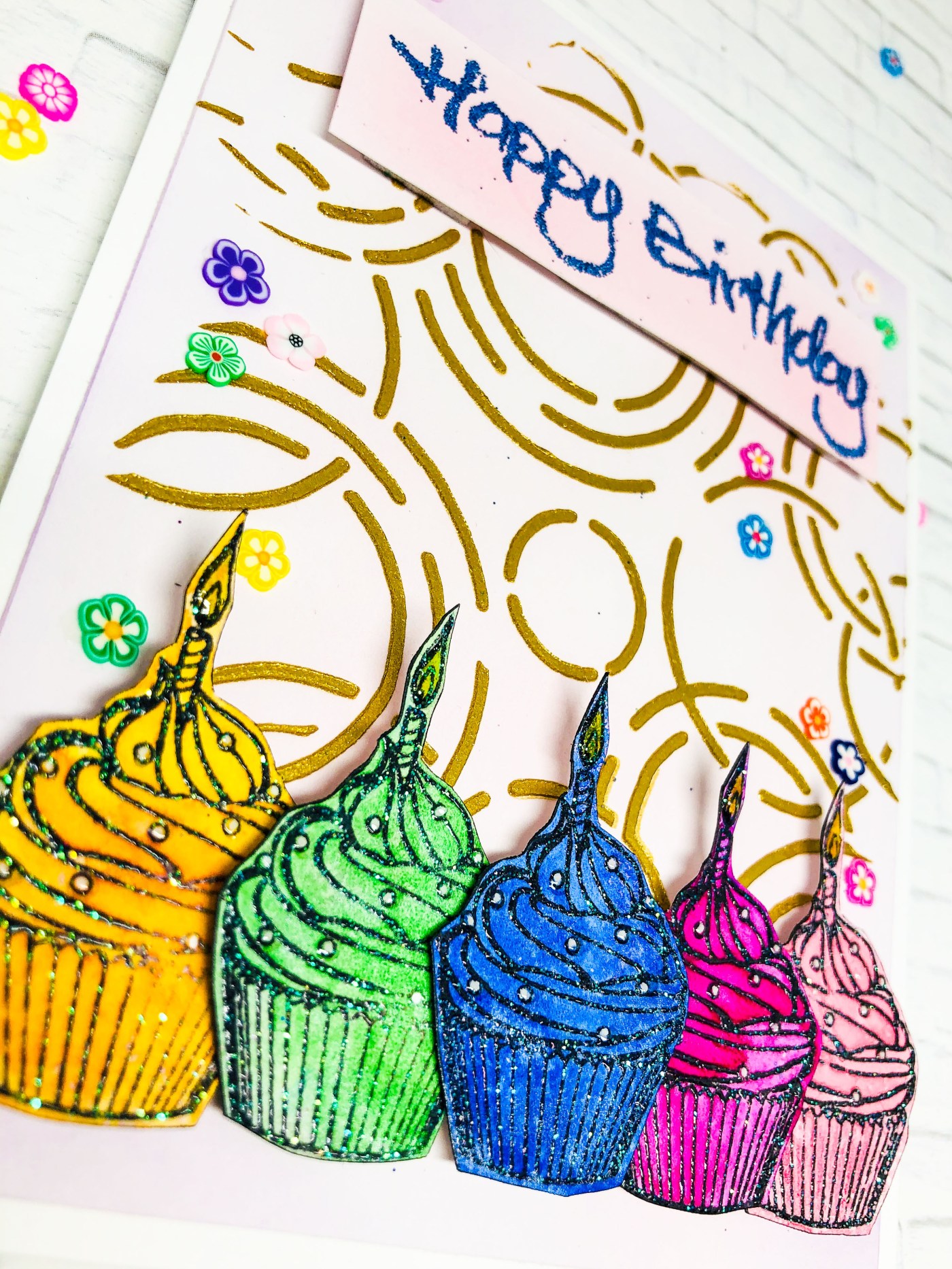 While the cupcakes were drying, I made a background using a little Spun Sugar Distress Ink on Bristol Smooth paper. Then I used some gold acrylic paint and the Visible Image Ripples stencil for a fun background.