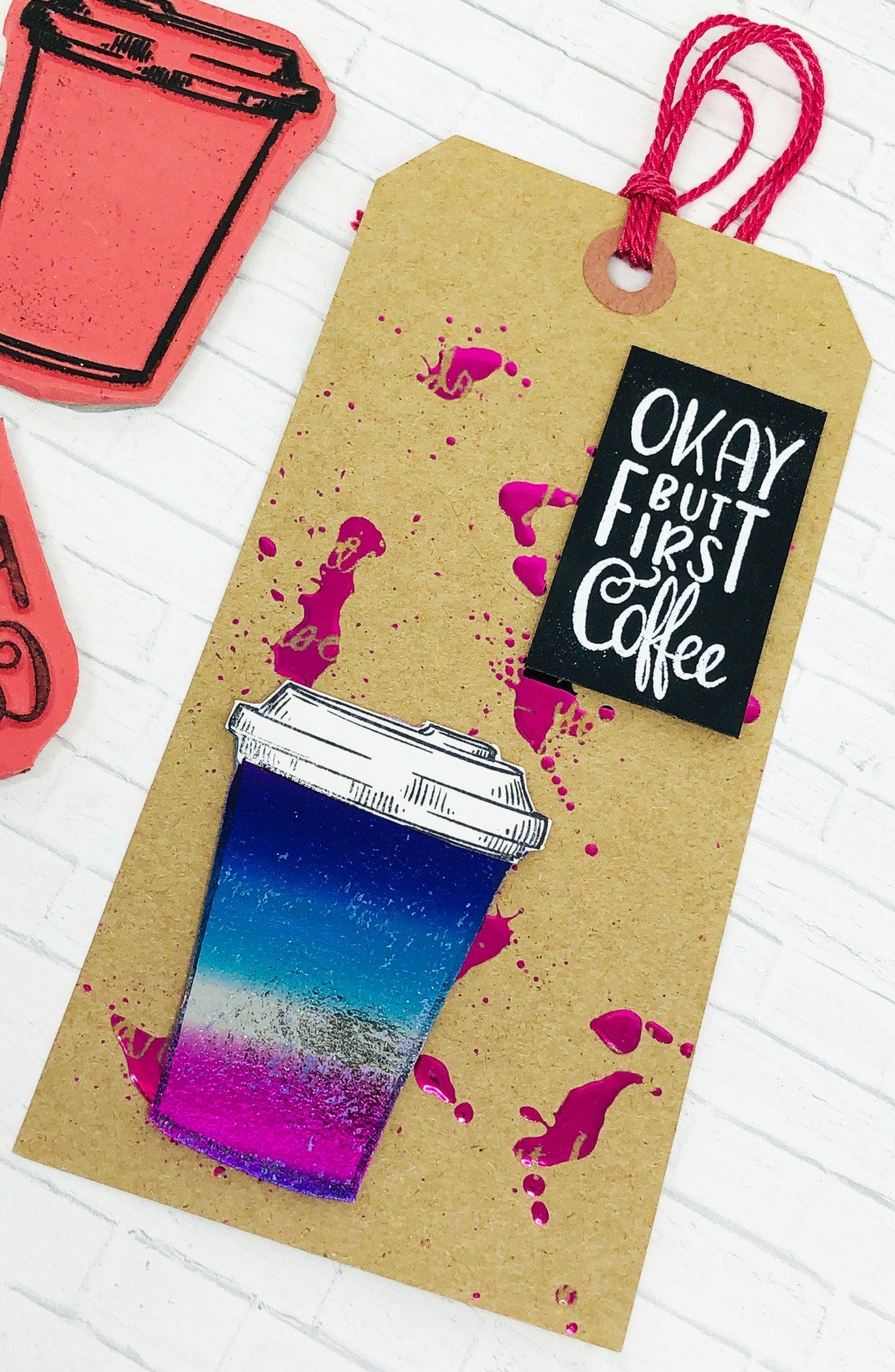 I’ve been playing and foiling everything and used reactive spray on a tag with pink foil. I had some extra foiled papers and decided to stamp the cup on this rainbow piece.