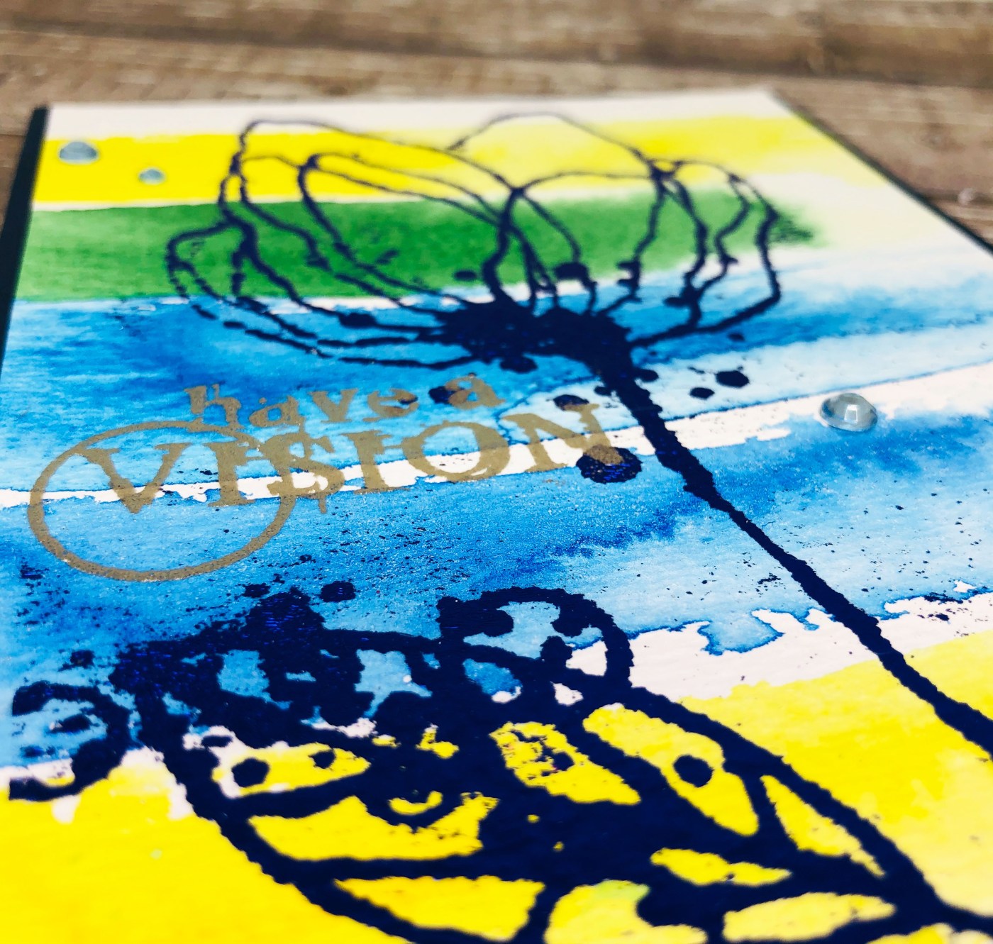 I started off by taking a background I had made previously watercoloring stripes. I then used an anti static tool on the background to make sure there were no oils to attract the fine powder. I stamped the flower and leaves from the Visible Image Total Chaos set onto the paper with WOW! Embossing ink in my MISTI. I then sprinkled some WOW! Bonding Powder and heated it up until it was shiny.