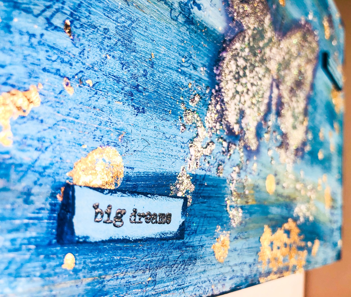 I wanted to add words and found some small pieces of wood that I painted the same blues as the box. I stamped the sentiments from the Visible Image Beautiful Soul in black Versafine and clear heat embossed them.