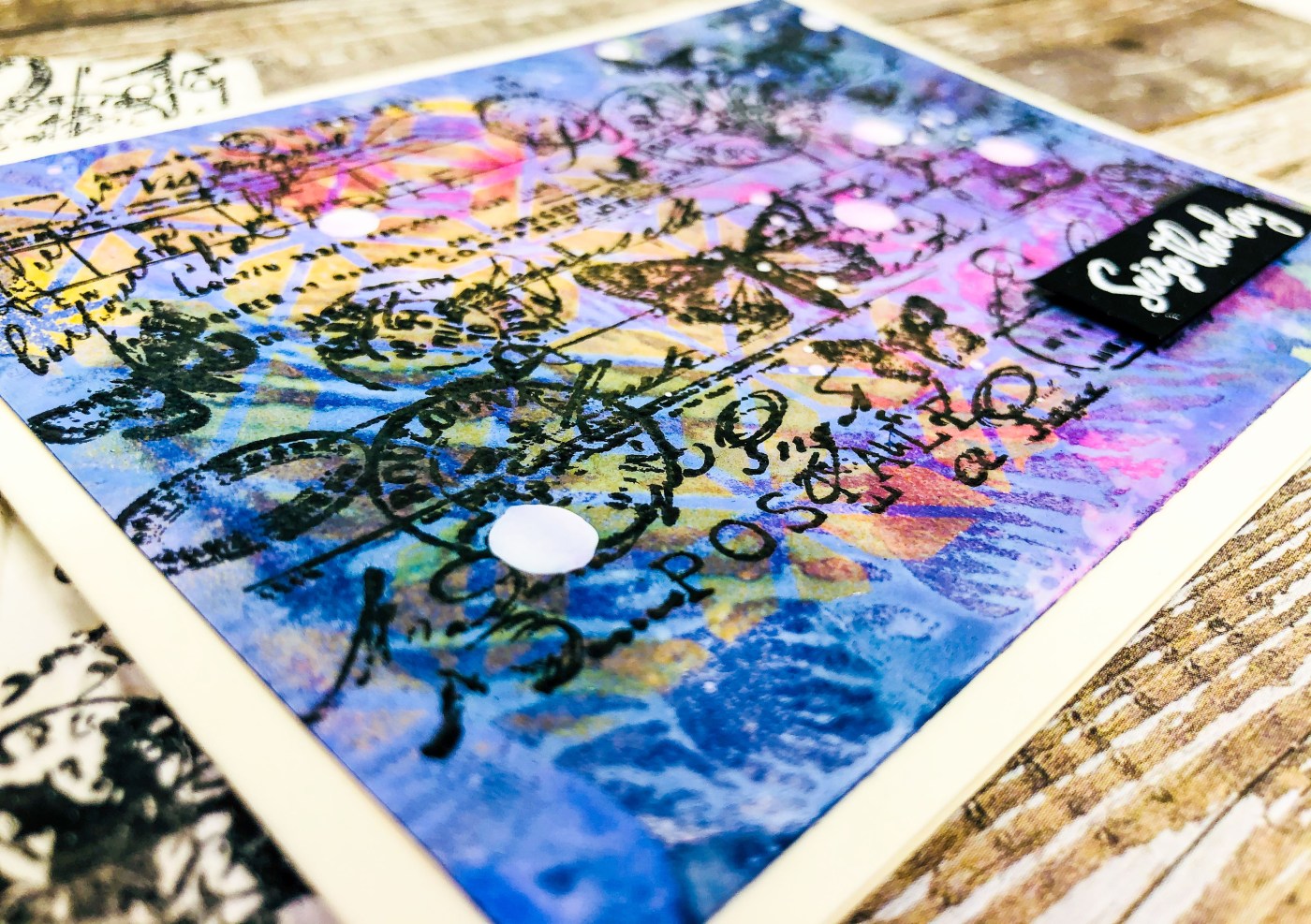 For my first card I used embossing ink to stamp the Postcard image on the Distress Oxide gel print. I used the Sunflower WOW! Embossing Powder part of the Parc Floral set to heat emboss the image.