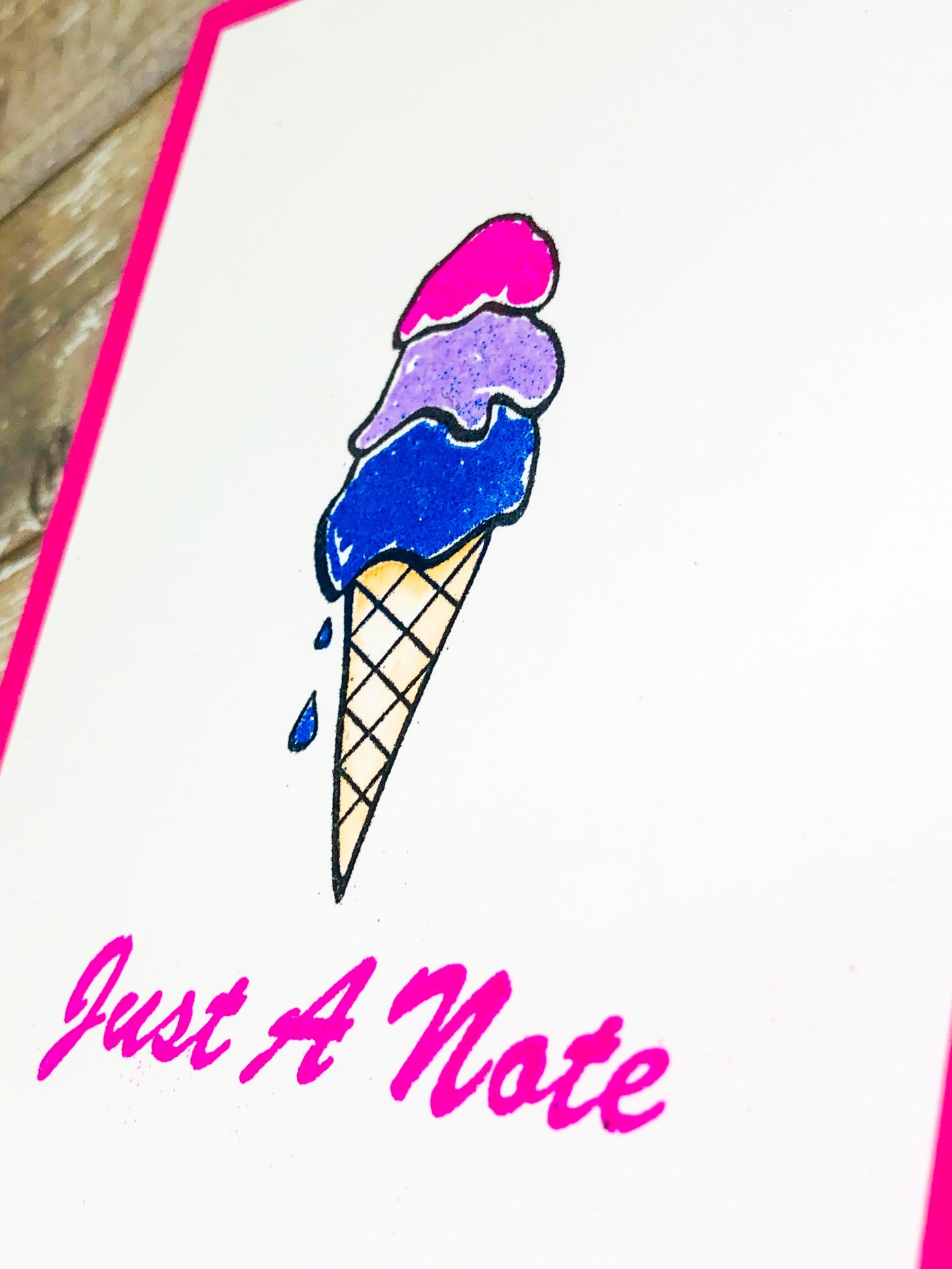 I used the embossing pen to color in the scoops and then sprinkled embossing powder to heat emboss the image. I love the shiny look it gives this fun ice cream.