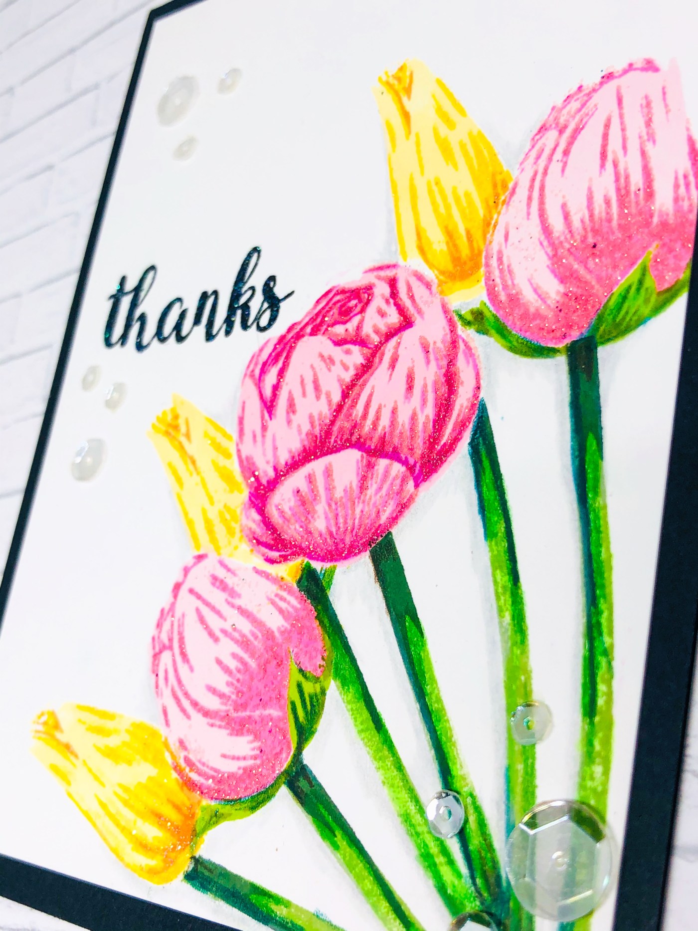 Lovely bold colors for your layered tulips, Ericka, and I love how you added both pink and clear e/p and sequins to give your pretty thank you design lots of schparkle!! Keep well! Hugs, Darnell