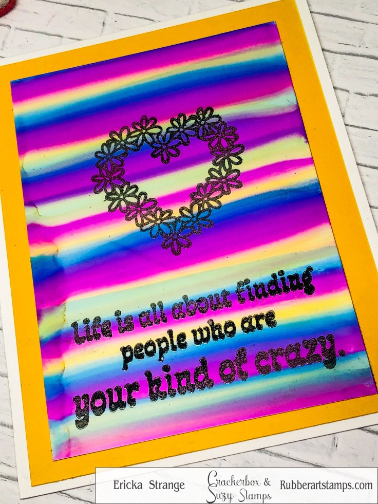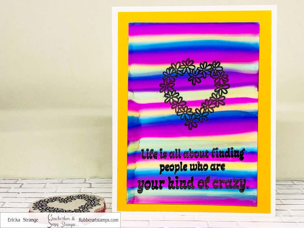 I stamped the Daisy Heart in Versafine ink and clear heat embossed it. I also stamped the fun Your Kind of Crazy sentiment in the same ink.