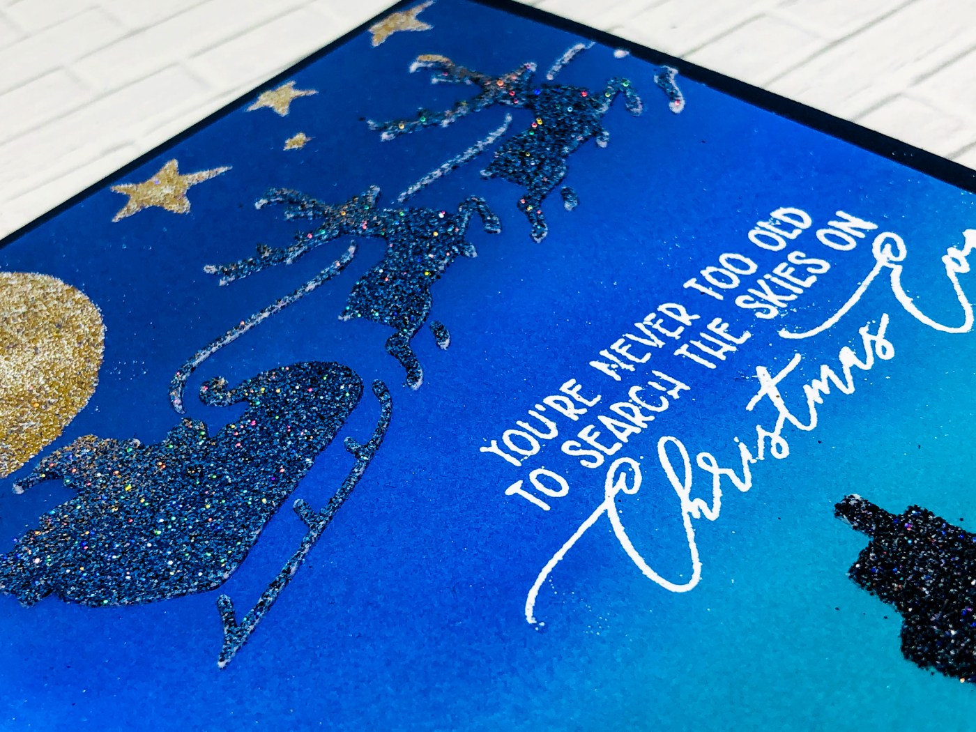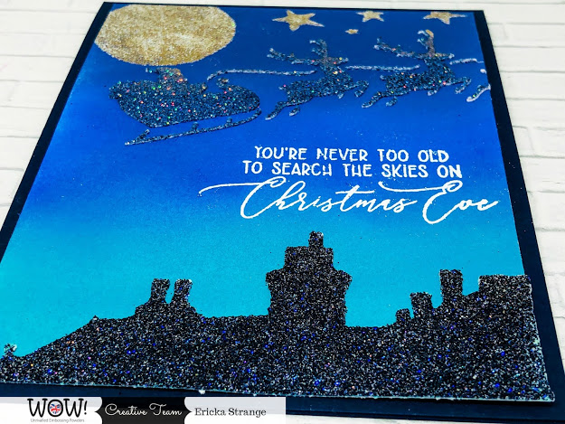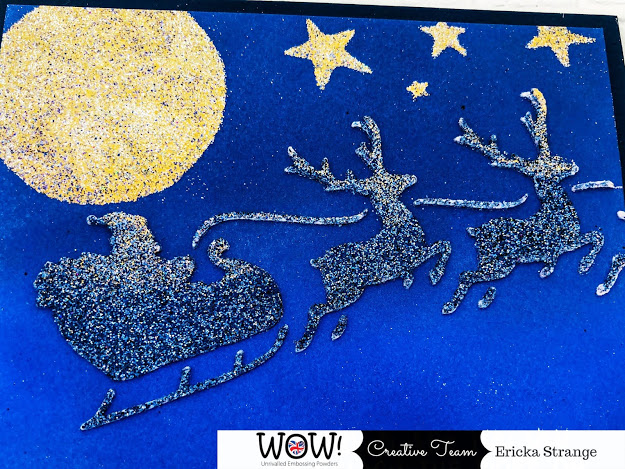 I then added the Visible Image Christmas Eve stencil with texture paste. I used the Black Glint Embossing Powder with the WOW! Changer Texture and Glisten to make my embossing powder more glittery with a fun texture. I also used the texture paste for Santa and his sleigh and added the Midnight Dream embossing powder with the WOW! Changer Glisten.