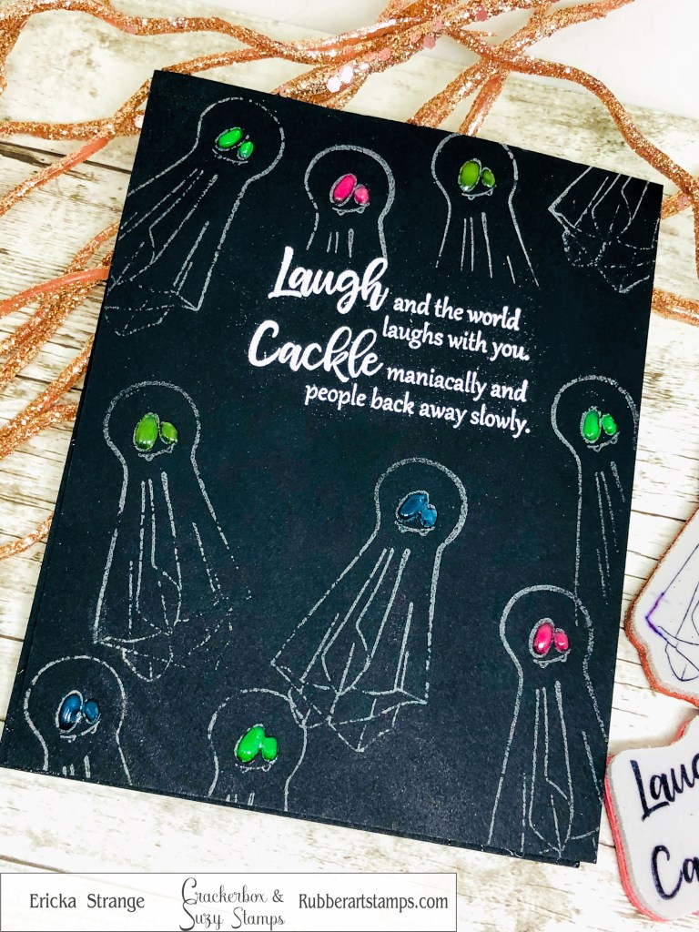 I love this stamp and paired it with WOW! Embossing Glow In the Dark Embossing Powder and Nuvo Glow Drops for add fun. I stamped the Laugh Cackle sentiment and heat embossed it in white.