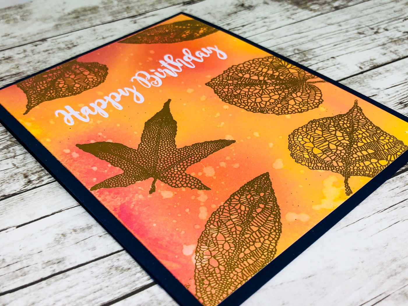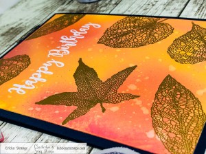 I then stamped the Birthday sentiment and heat embossed it in white. I added the various Skeleton Leaves and heat embossed them in gold for a nice, rich fall color.
