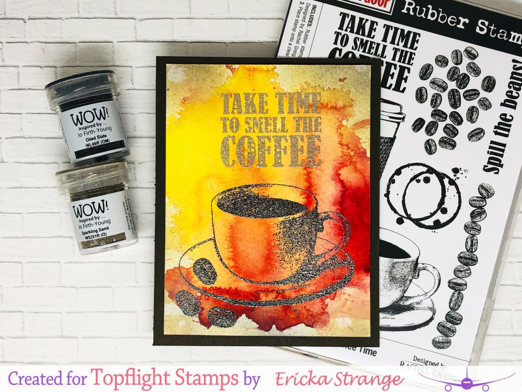 For the second card, I used a watercolor background and stamped the coffee cup and beans and heat embossed it with WOW! Embossing Trio Dockside in Oiled Sand.