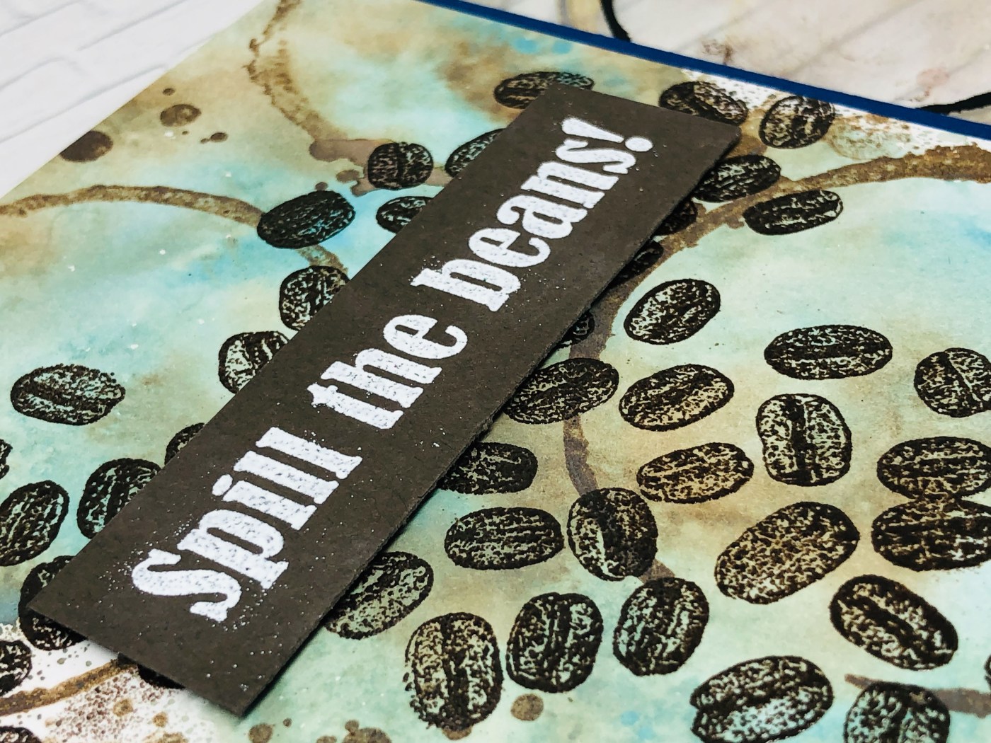 I added the beans from the from the Darkroom Door Coffee Time and stamped them in the same Distress Ink and used Distress Glaze in Walnut Stain to help the beans stand out.