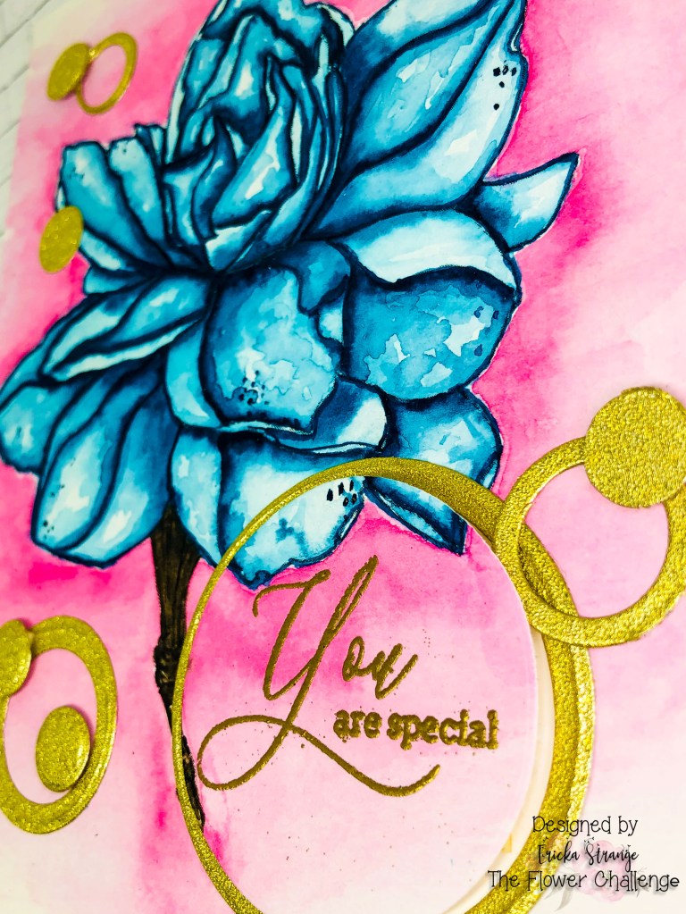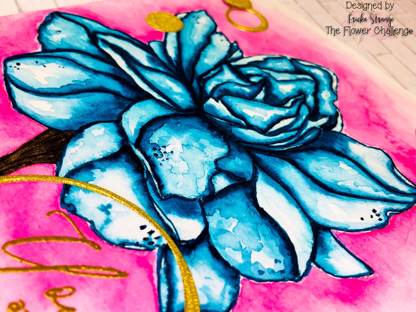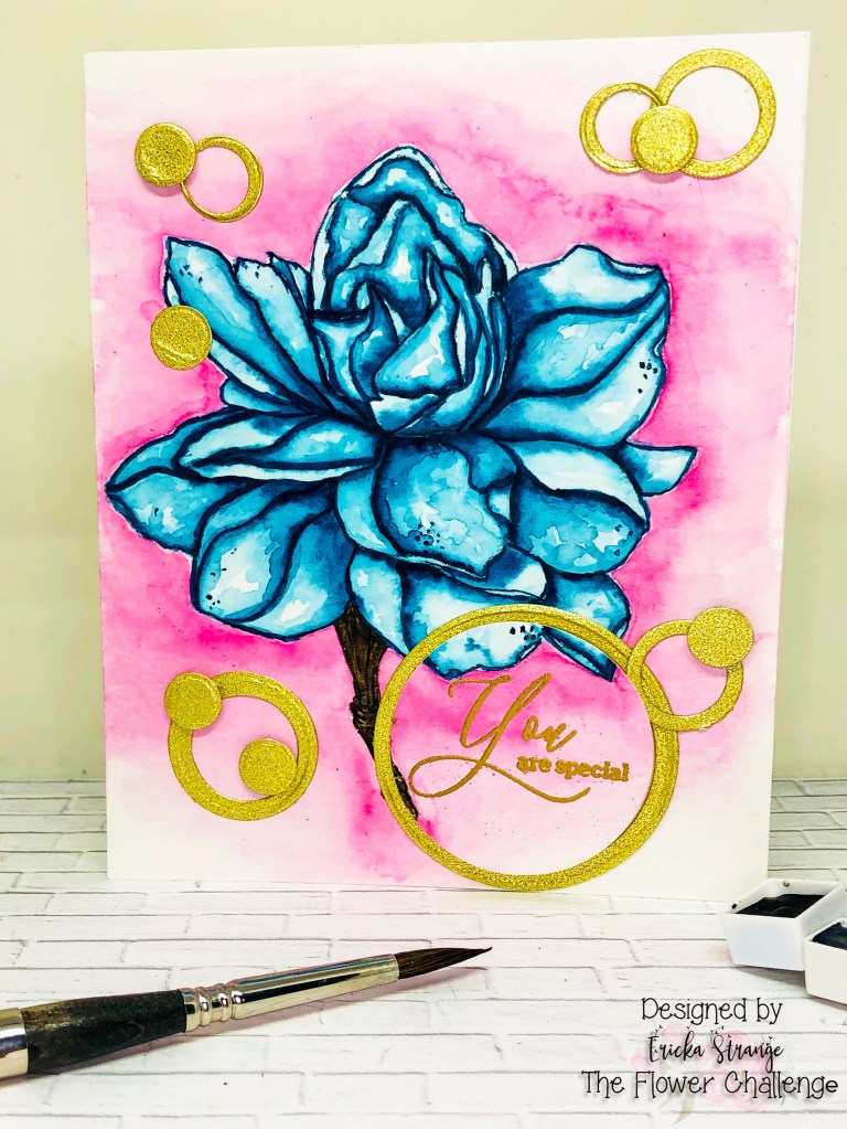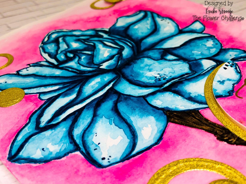 WOW! Amazing watercolour of your gorgeous flower and background Erika! The colours are so bright, bold and beautiful! The gold circles add lots of shine. Looking forward to working with you on TFC DT! Loll