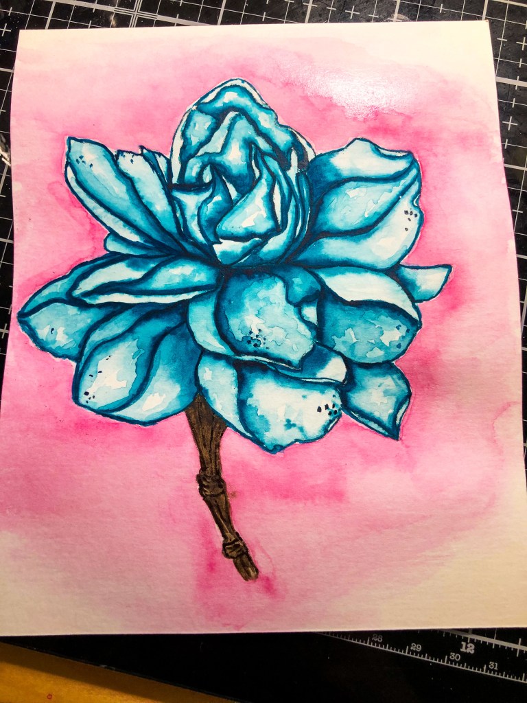 I love this gorgeous digital image and the fact that I can make the flower as big or small as I need. For my flower I used Prussian Blue and then used Quinacridone Pink for the background.