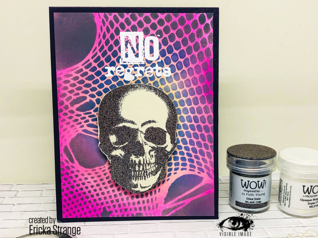 I stamped the skull on light gray paper and heat embossed it in Oiled Slate for a dark and shiny look. I fussy cut the image and added it to my card with foam tape.