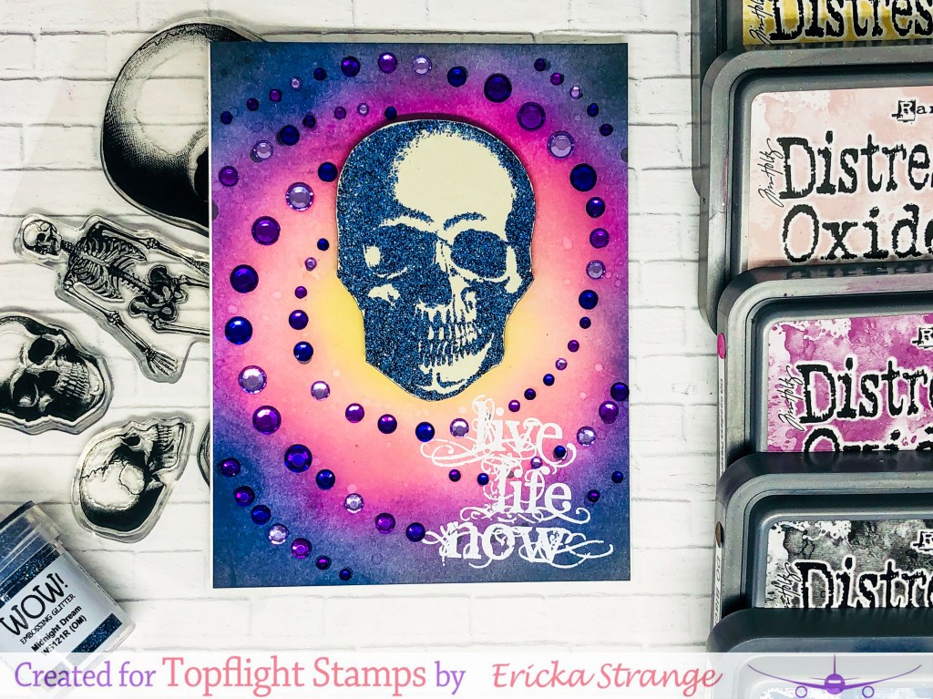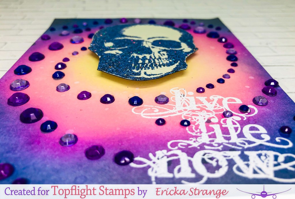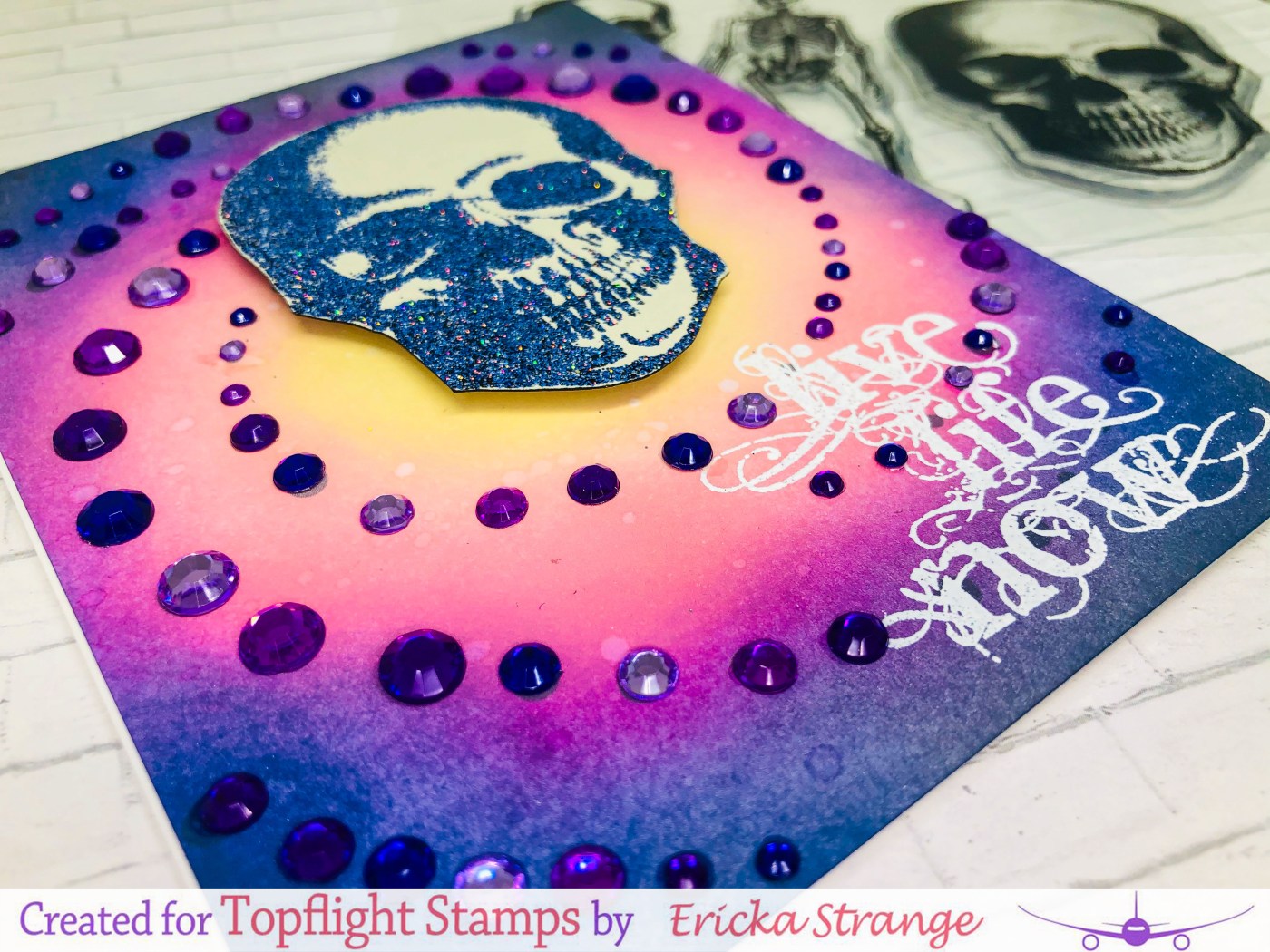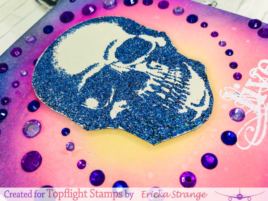 I stamped the skull on light gray paper and heat embossed it in Midnight Dream for a shiny look. I fussy cut the image and added it to my card with foam tape.