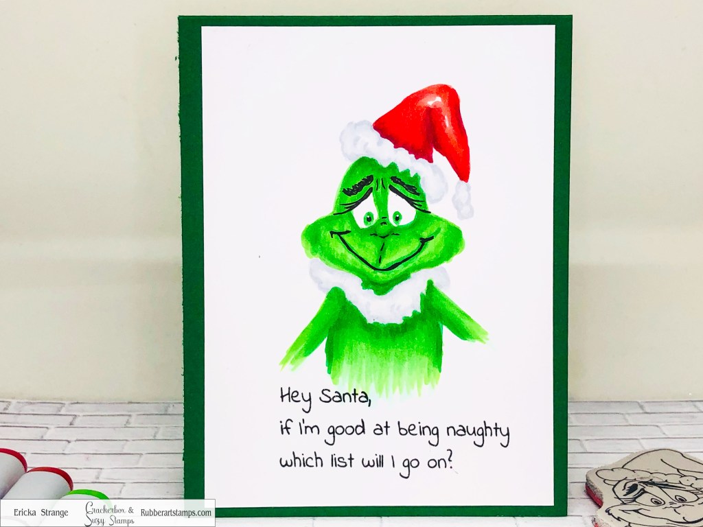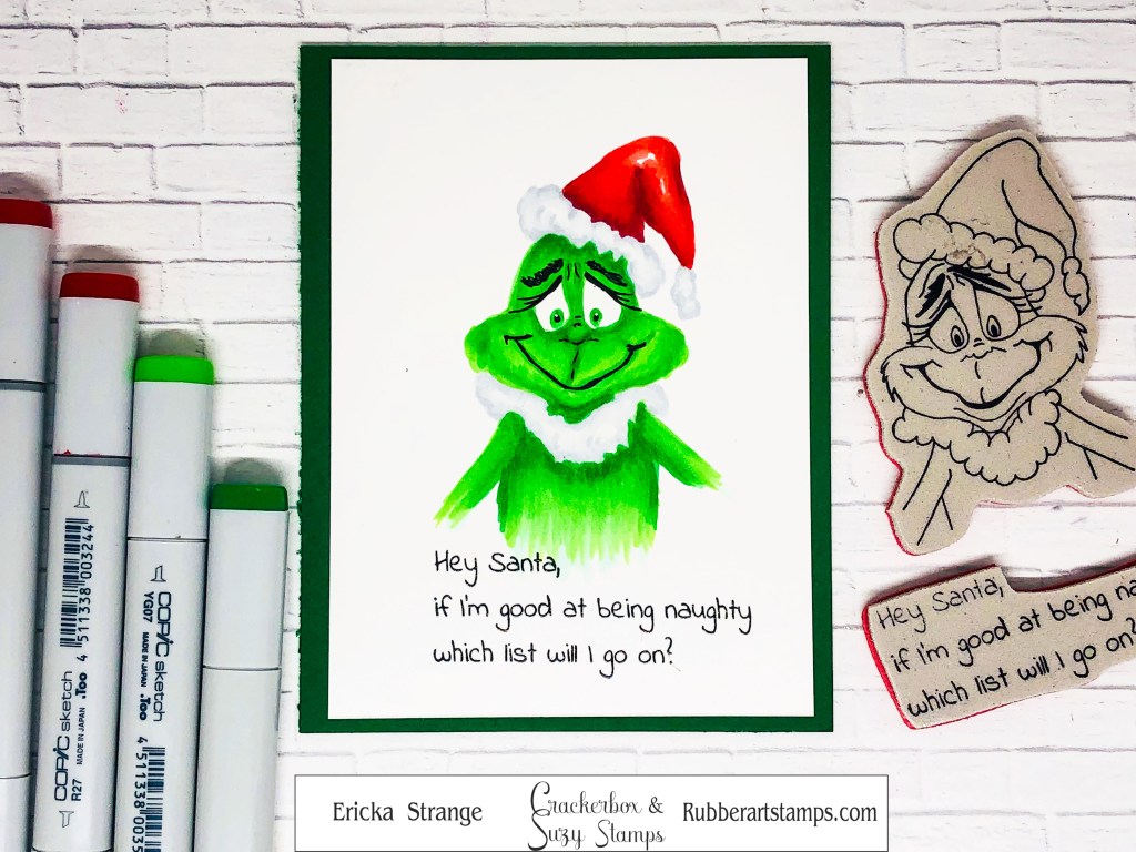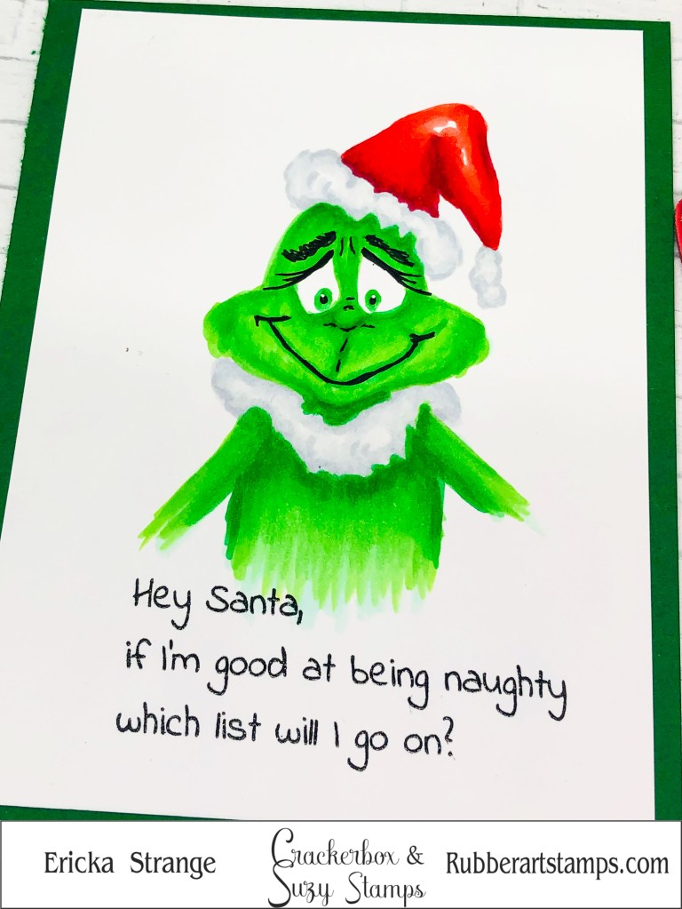 Crackerbox & Suzy Stamp is having an awesome new release today with lots of fun and snarky Christmas stamps. Go check out the blog for more information and a chance to win great prizes. Here is the card I made with the new release using the Grinch stamp with the Hey Santa sentiment.
