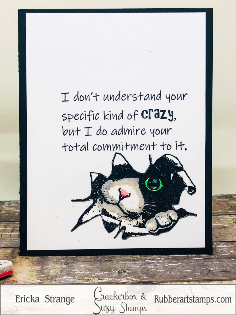 I love this fun cat and decided to play around with it by stamping it in Versafine and clear heat embossed it. I then used some markers color in the image. I wanted it to look like my cat tore through the card, so I fussy cut the image out and glued it to the card base that I had stamped the Don’t Understand sentiment.
