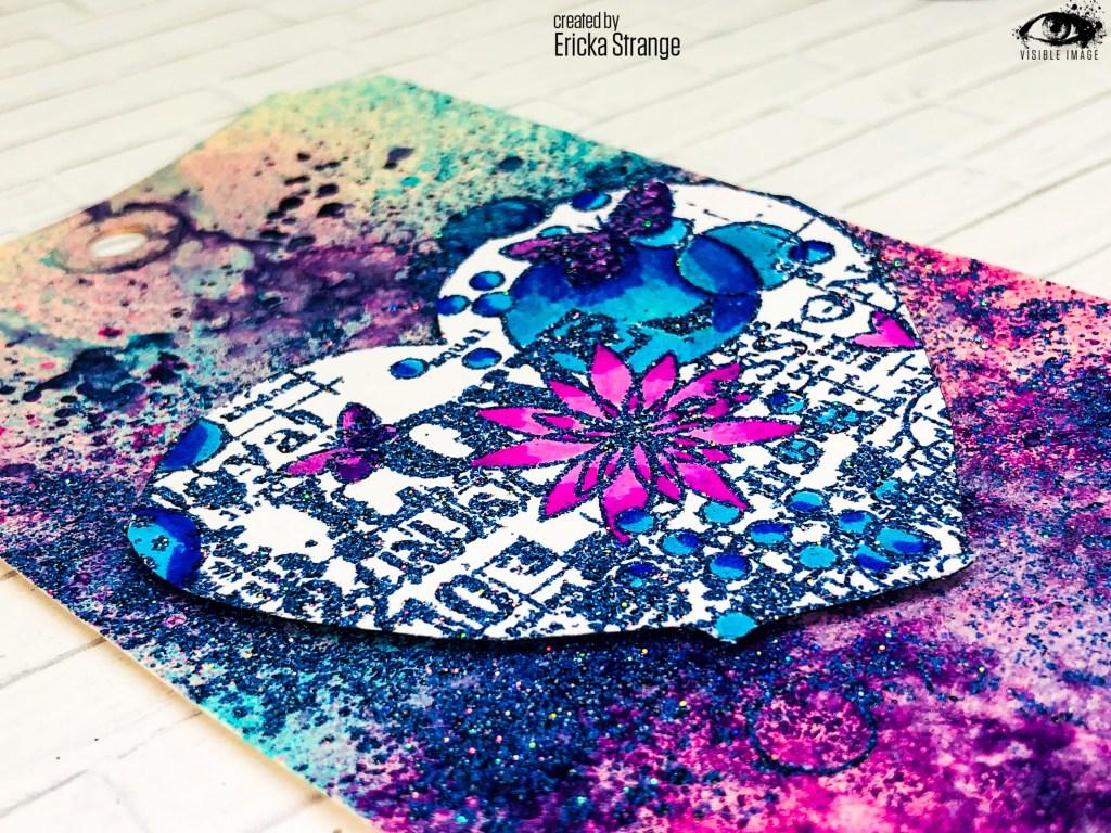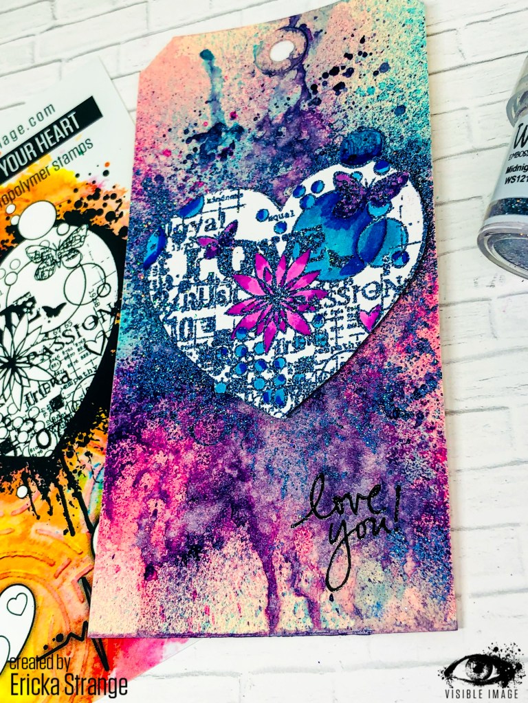 I cut the heart out and then used sharpies to color in some of the images. I then attached the heart with foam tape to the tag. I love the texture the embossing powder gives the busy background.