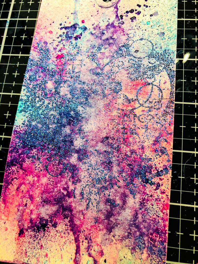 I love the details in this stamp. I started out with spraying a variety of Dina Wakley Media Sprays and let them dry. I then stamped the large image and heat embossed it with WOW! Midnight Dream.