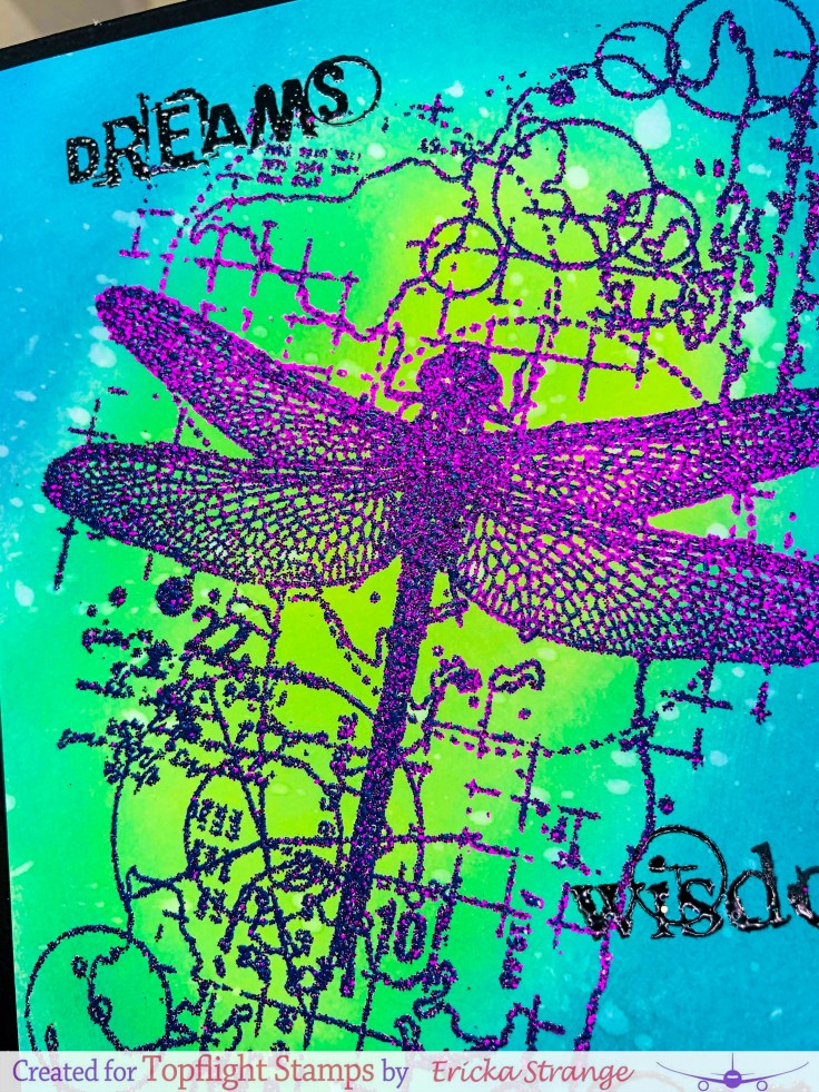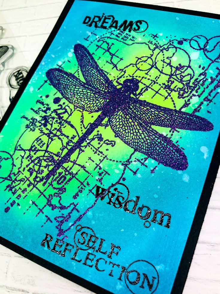 After my background was dry, I stamped the beautiful dragonfly image and heat embossed it with WOW! Persian Indigo for a sparkly purple.