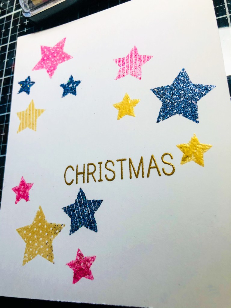 I started out by randomly stamping the stars and alternating heat embossing them in Midnight Dream, Razzeberry, Gold Pearl. I love the coverage of these powders and how the small details still show on the stars. I then stamped the sentiment in Metallic Gold.