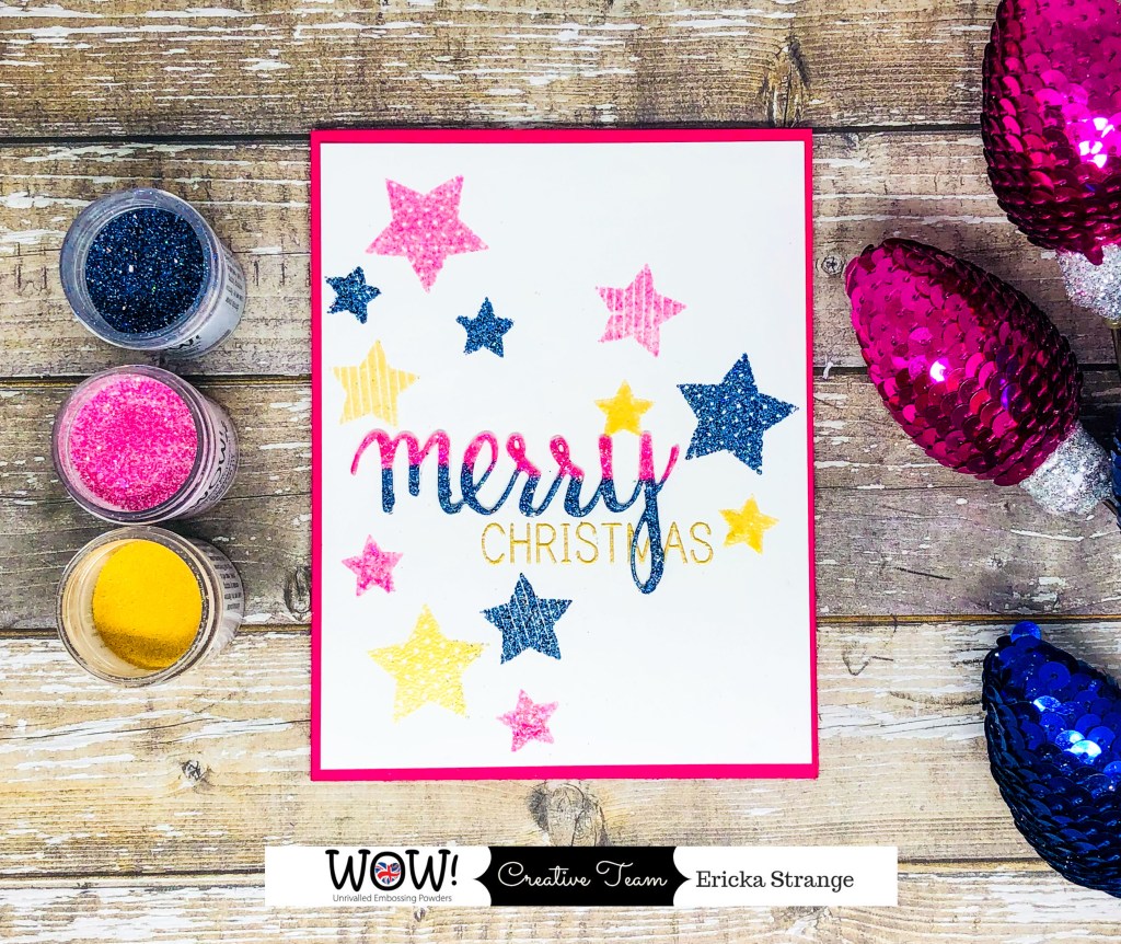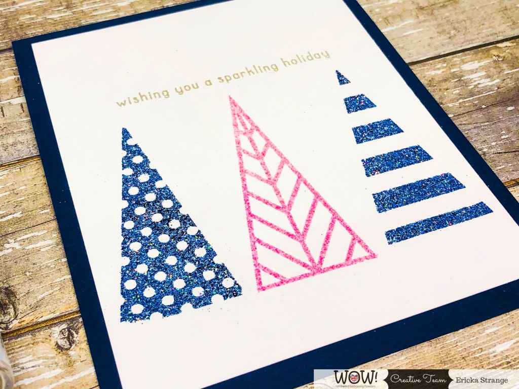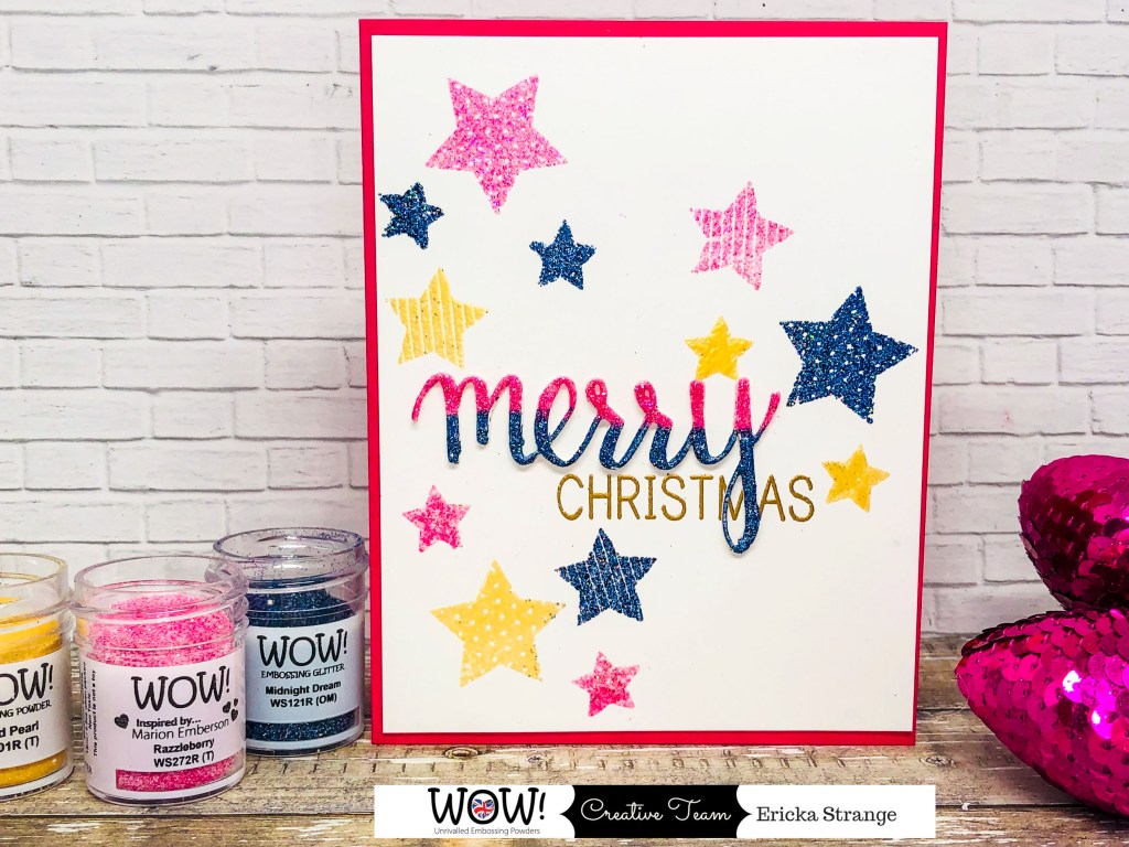 I took a separate piece of white cardstock and die cut the “Merry” sentiment three times and glued them together. Once it was dry, I used the WOW! Mixed Media Brush and applied a light layer of ink on the top portion of my die cut. I heat embossed the top portion in Razzelberry powder and repeated the step for the bottom portion in Midnight Dream.
