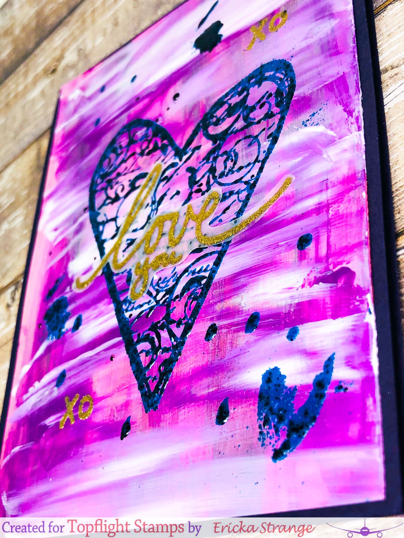 Once my background was dry, I used the Emerald Creek embossing powder in Midnight Magic to stamp this beautiful heart and added additional embossing using the WOW! Mixed Media Tool.