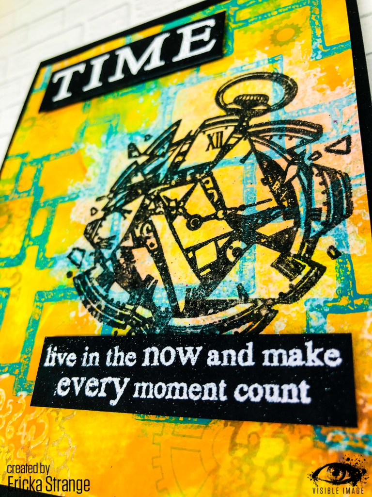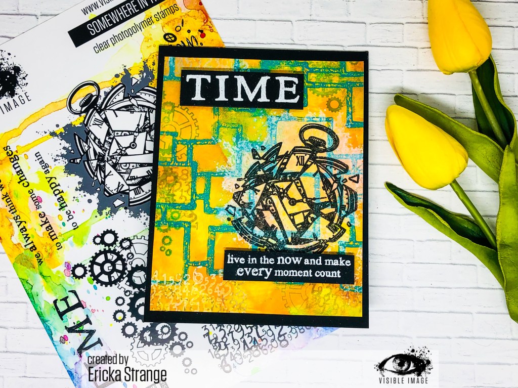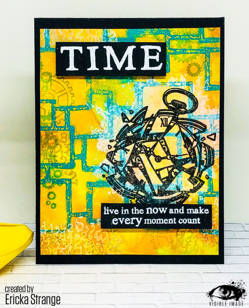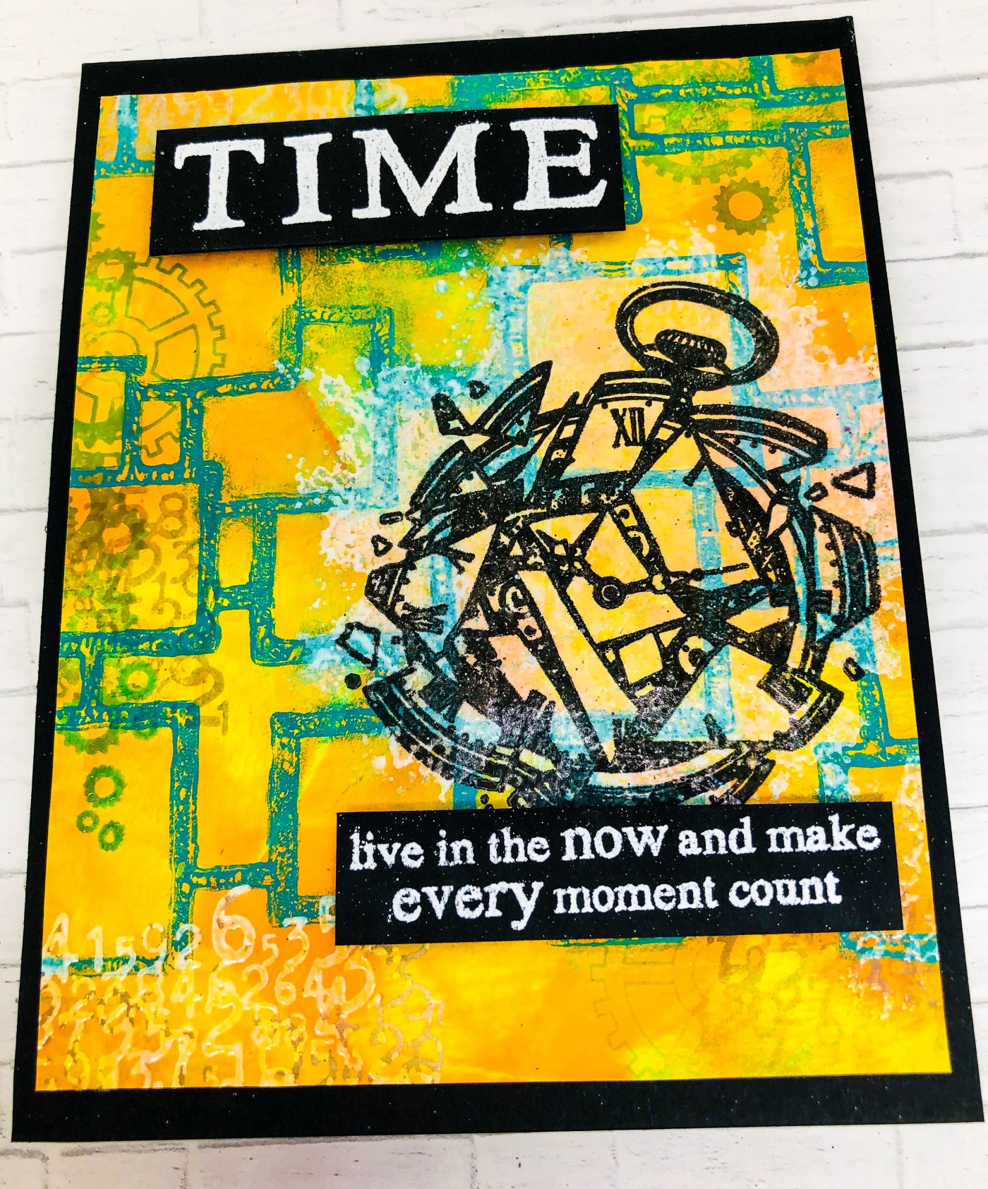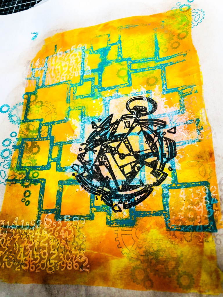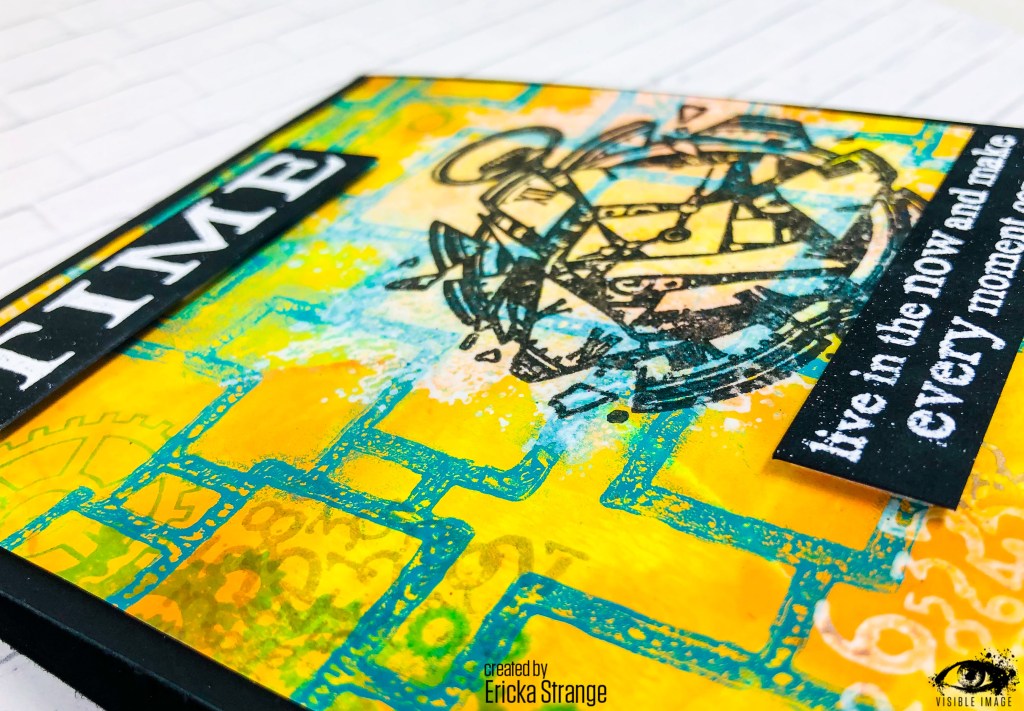 Happy Monday! Today I’m playing with the Visible Image Somewhere in Time set along with my gel plate and the Visible Image Square Route stencil.