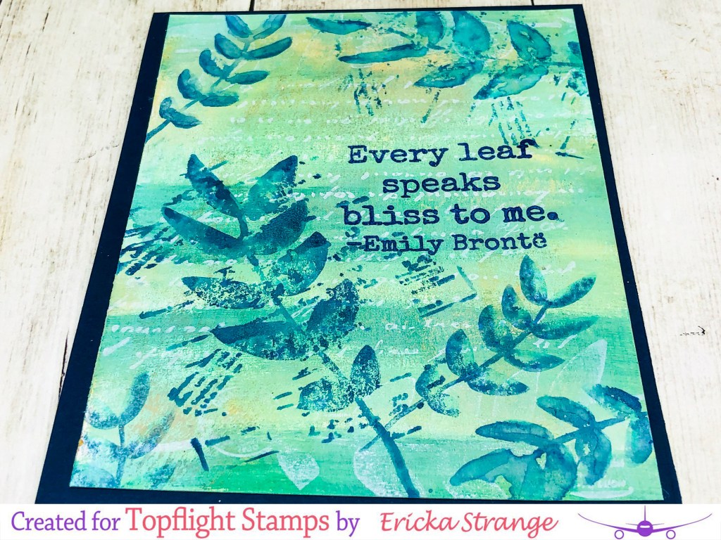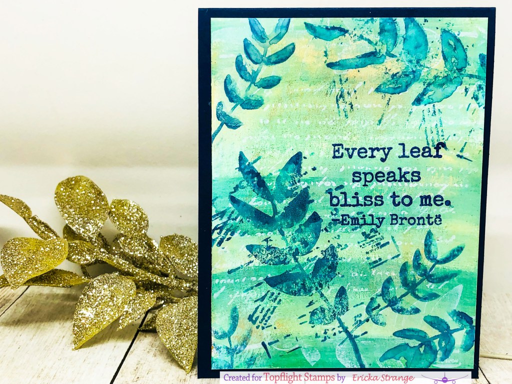 I created my background using the following PaperArtsy Fresco Paints: Caramel, Gold Rush, Pistachio, and South Pacific. Once my image was dry, I used white ink to stamp the script image twice. I then used the Prism Brush markers in Blue Lagoon and lightly misted them for a watercolor look.